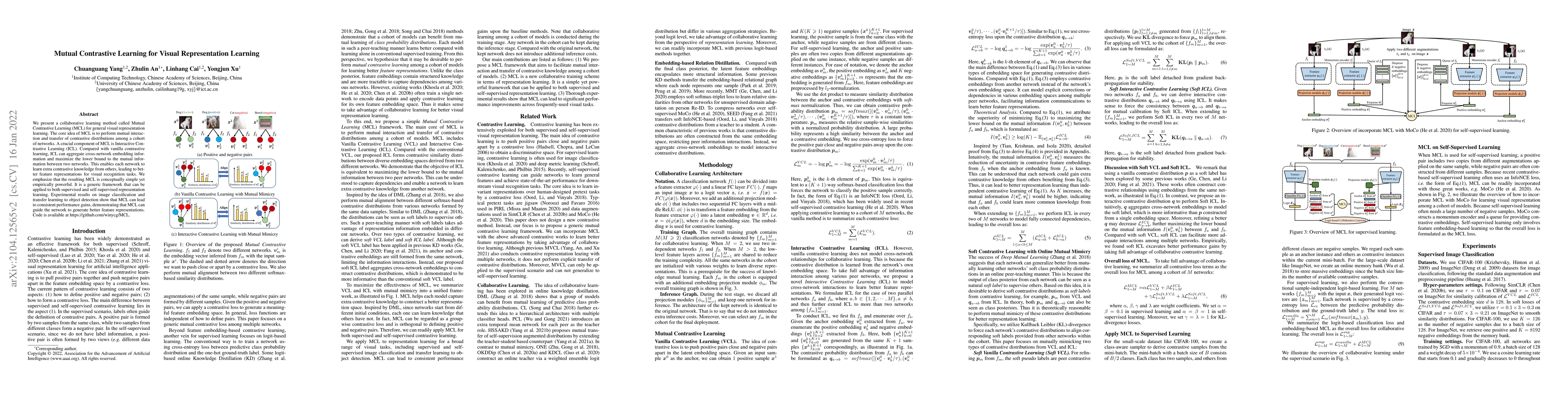 The paper introduces Mutual Contrastive Learning (MCL), a collaborative method that leverages mutual interaction among networks to enhance visual representation learning. MCL, which includes Interactive Contrastive Learning (ICL), aggregates cross-network embedding information, leading to improved feature representations for visual recognition tasks, as demonstrated by gains in image classification and object detection.