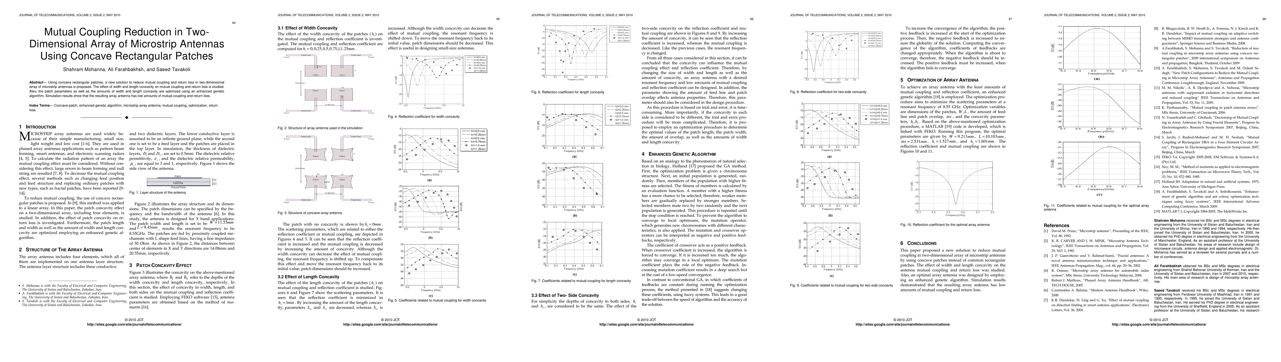 Summary: This paper proposes using concave rectangular patches to reduce mutual coupling and return loss in two-dimensional microstrip antenna arrays. Optimization of patch parameters and concavity dimensions via an enhanced genetic algorithm results in significant reductions in mutual coupling and return loss, as demonstrated by simulation results.