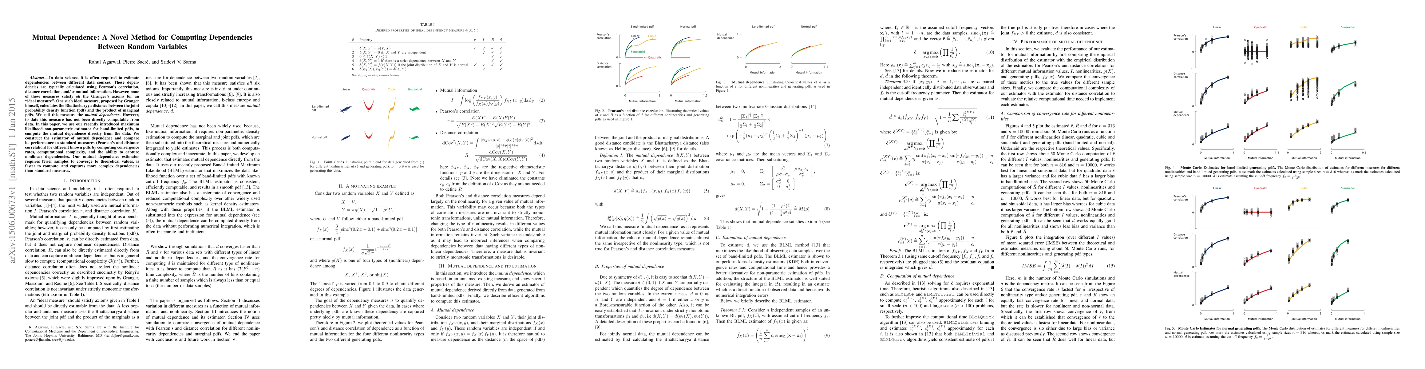 A new method called mutual dependence estimates dependencies between random variables more accurately than existing measures like Pearson's correlation and distance correlation, requiring fewer samples and computing faster.