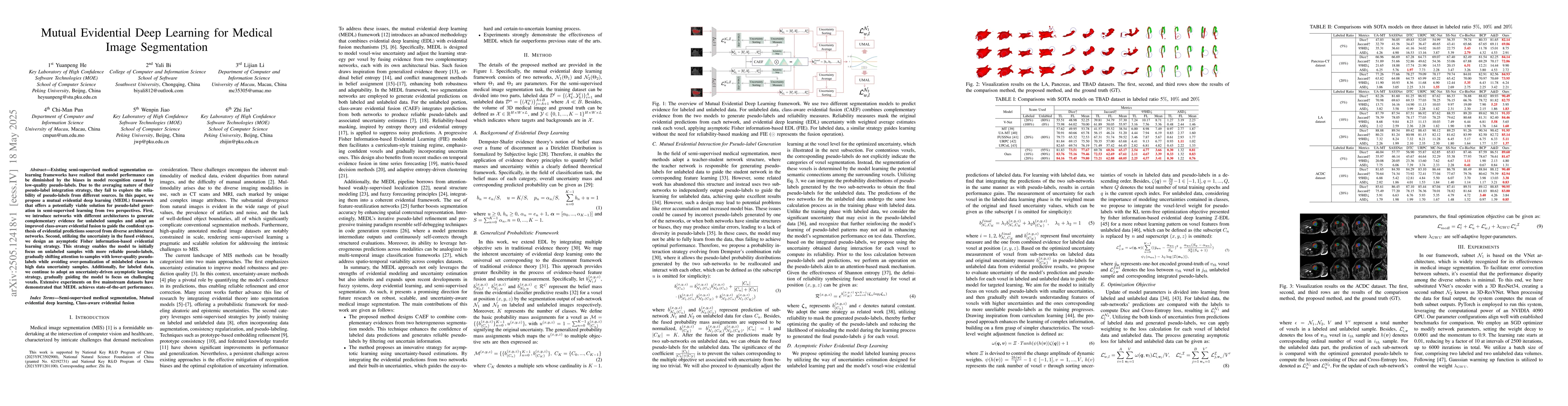 The proposed Mutual Evidential Deep Learning (MEDL) framework utilizes networks with different architectures to generate complementary evidence for unlabeled samples, employing an improved class-aware evidential fusion. It also introduces an asymptotic Fisher information-based evidential learning strategy to focus on unlabeled samples with reliable pseudo-labels, gradually shifting to those with lower-quality labels. For labeled data, the framework maintains an uncertainty-driven asymptotic learning strategy to concentrate on challenging voxels.