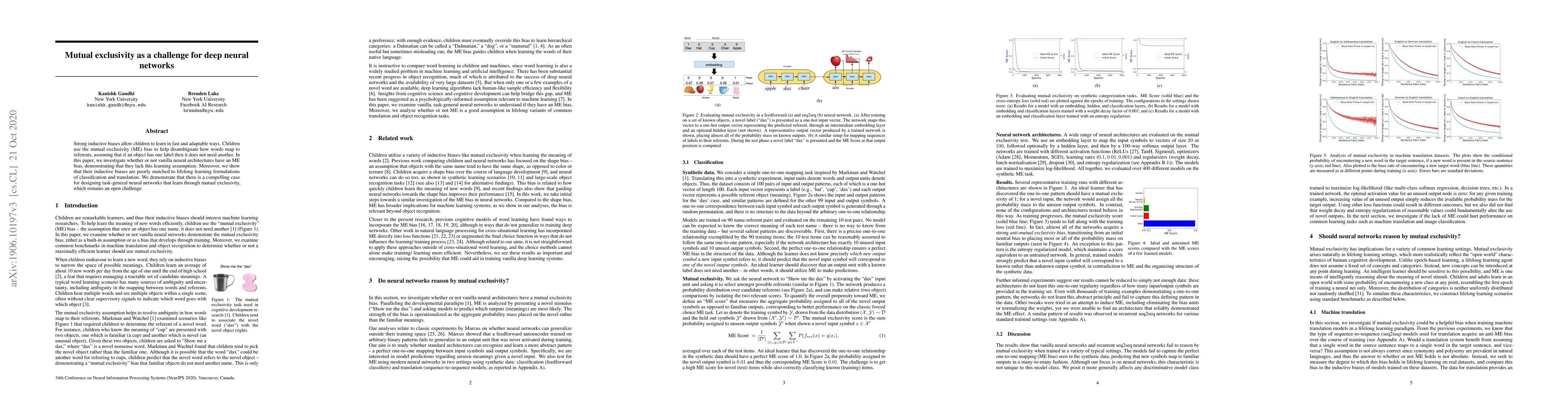 Strong inductive biases allow children to learn in fast and adaptable ways. Children use the mutual exclusivity (ME) bias to help disambiguate how words map to referents, assuming that if an object has one label then it does not need another. In this paper, we investigate whether or not standard neural architectures have an ME bias, demonstrating that they lack this learning assumption. Moreover, we show that their inductive biases are poorly matched to lifelong learning formulations of classification and translation. We demonstrate that there is a compelling case for designing neural networks that reason by mutual exclusivity, which remains an open challenge.