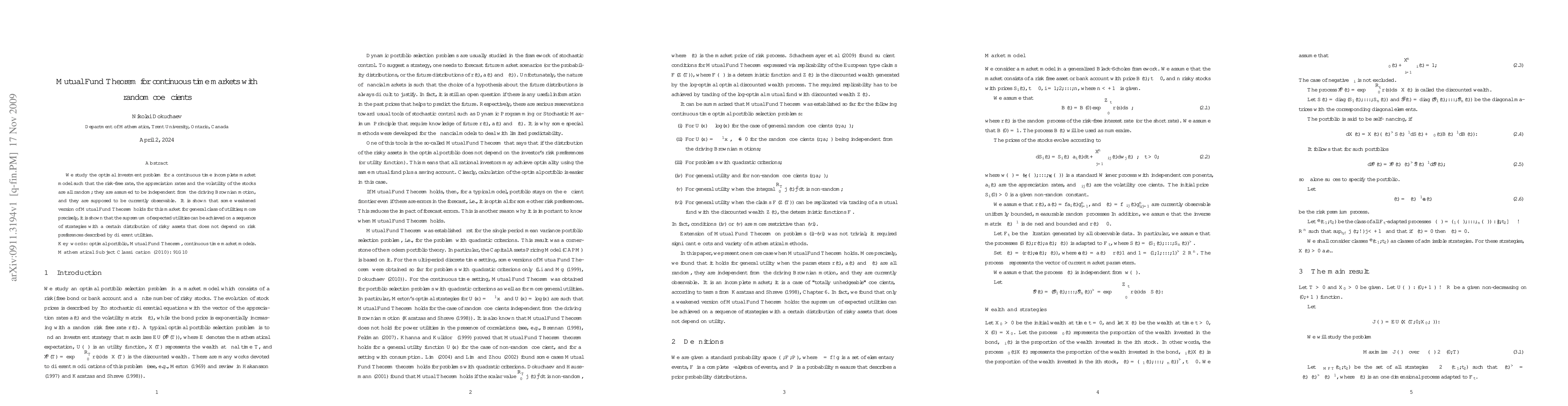 Researchers prove a weakened version of the Mutual Fund Theorem for continuous time markets with random coefficients, showing that optimal investment strategies can achieve maximum expected utilities regardless of risk preferences.