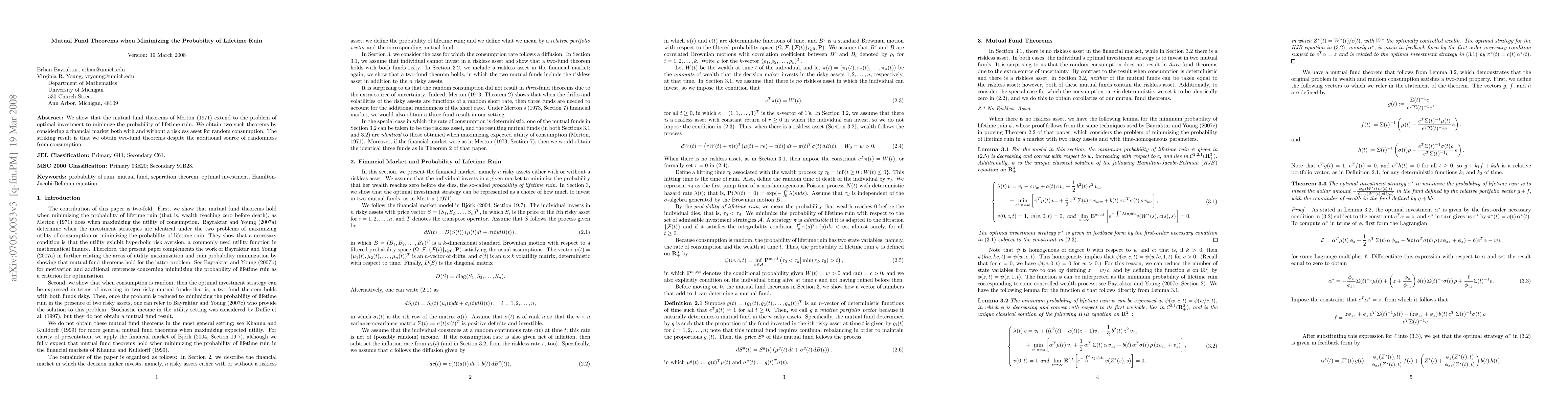 Summary: This paper extends Merton's mutual fund theorems to minimize the probability of lifetime ruin, deriving two-fund theorems in both risky and riskless asset markets, despite the added consumption risk. The findings highlight the robustness of these investment strategies under uncertainty.