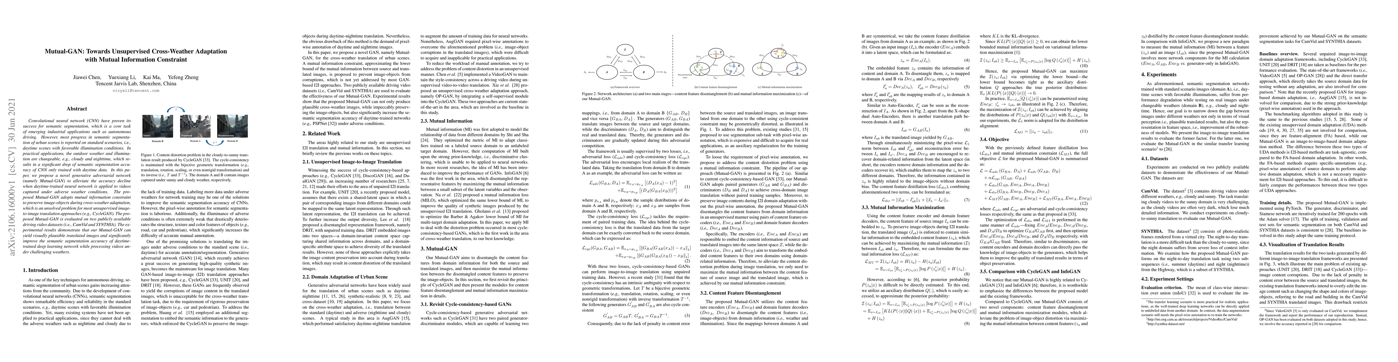 This paper introduces Mutual-GAN, a novel generative adversarial network designed to enhance the semantic segmentation accuracy of neural networks trained on daytime data when applied to videos captured under adverse weather conditions. The Mutual-GAN leverages mutual information constraints to maintain image-object fidelity during cross-weather adaptation, addressing a gap in existing unsupervised translation methods. Experimental results on CamVid and SYNTHIA datasets show significant improvements in segmentation accuracy under challenging weather conditions.