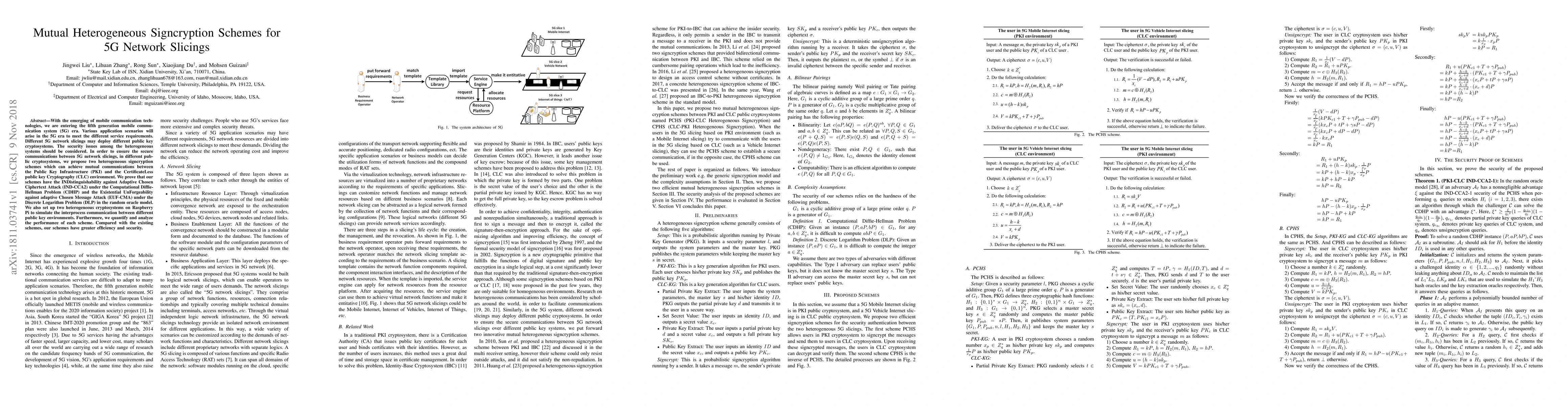This paper proposes two heterogeneous signcryption schemes for secure communication between different 5G network slicings using different public key cryptosystems. The schemes achieve mutual security under IND-CCA2 and EUF-CMA, and demonstrate superior efficiency and security compared to existing methods.