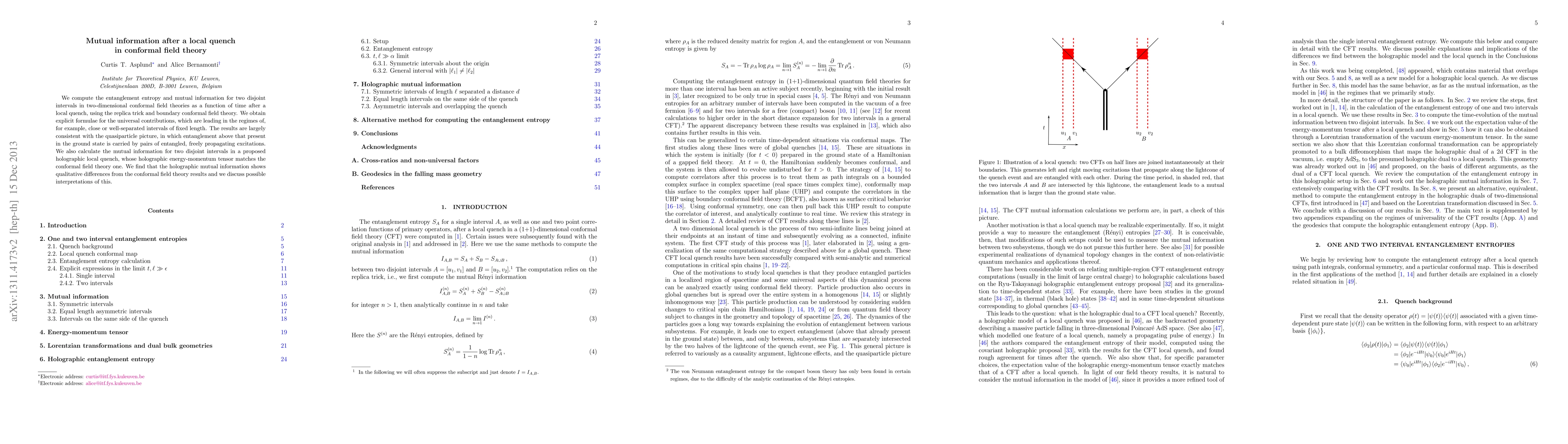 This paper computes entanglement entropy and mutual information in two-dimensional conformal field theories following a local quench, revealing universal contributions and consistency with the quasiparticle picture. It also compares these results with a holographic model, finding qualitative differences and discussing their implications.