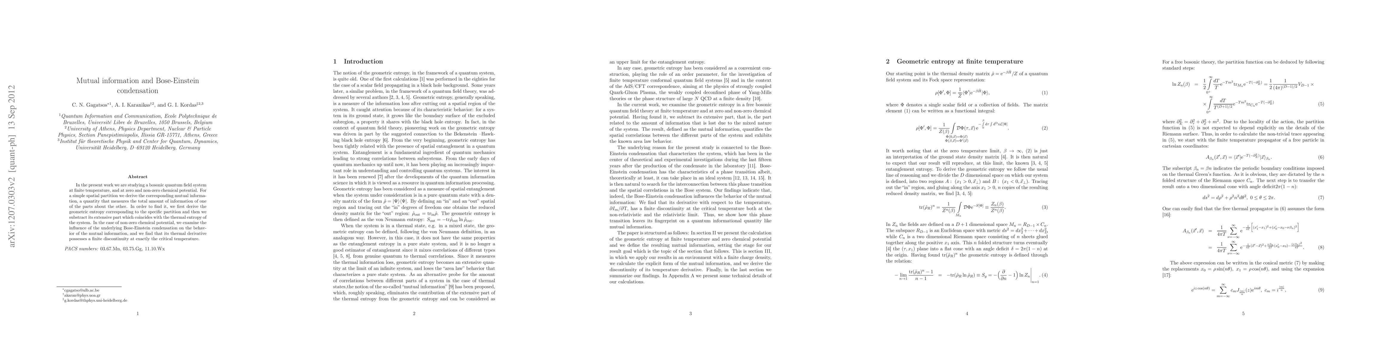 This paper investigates mutual information in a bosonic quantum field system at finite temperature, deriving it through geometric entropy and thermal entropy. It reveals a finite discontinuity in the thermal derivative of mutual information at the critical temperature of Bose-Einstein condensation, highlighting its influence.