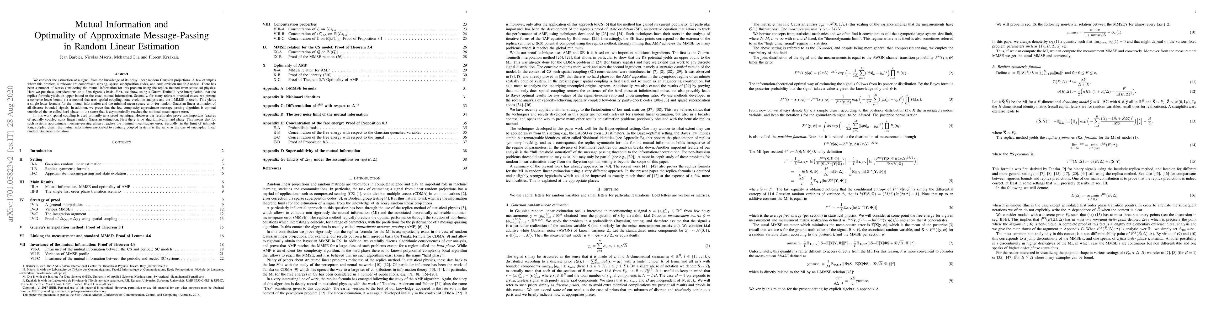 This paper rigorously establishes the optimality of approximate message-passing algorithms for estimating signals from noisy linear Gaussian projections, providing both upper and lower bounds on mutual information using spatial coupling and state evolution. It demonstrates that these algorithms achieve optimal performance outside the hard phase, ensuring minimal-mean-square error.