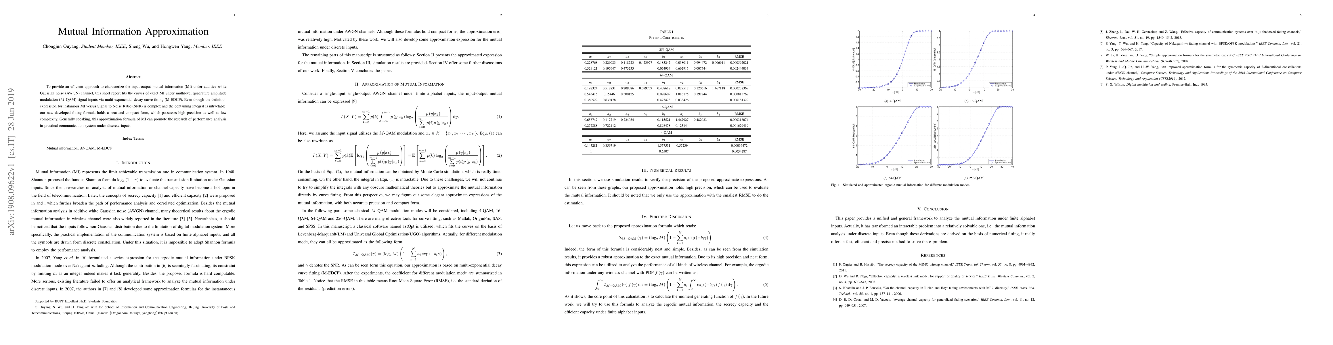 To provide an efficient approach to characterize the input-output mutual information (MI) under additive white Gaussian noise (AWGN) channel, this short report fits the curves of exact MI under multilevel quadrature amplitude modulation (M-QAM) signal inputs via multi-exponential decay curve fitting (M-EDCF). Even though the definition expression for instanious MI versus Signal to Noise Ratio (SNR) is complex and the containing integral is intractable, our new developed fitting formula holds a neat and compact form, which possesses high precision as well as low complexity. Generally speaking, this approximation formula of MI can promote the research of performance analysis in practical communication system under discrete inputs.