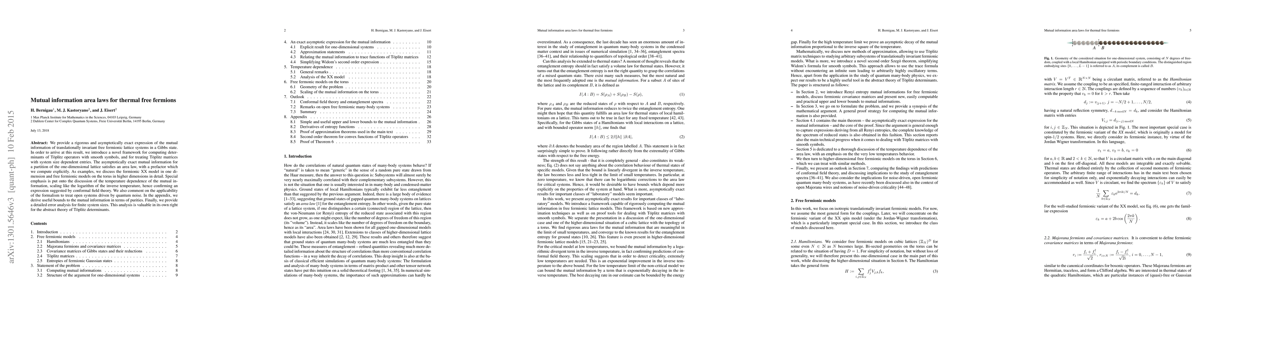 We provide a rigorous and asymptotically exact expression of the mutual information of translationally invariant free fermionic lattice systems in a Gibbs state. In order to arrive at this result, we introduce a novel frameworkfor computing determinants of Toeplitz operators with smooth symbols, and for treating Toeplitz matrices with system size dependent entries. The asymptotically exact mutual information for a partition of the one-dimensional lattice satisfies an area law, with a prefactor which we compute explicitly. As examples, we discuss the fermionic XX model in one dimension and free fermionic models on the torus in higher dimensions in detail. Special emphasis is put onto the discussion of the temperature dependence of the mutual information, scaling like the logarithm of the inverse temperature, hence confirming an expression suggested by conformal field theory. We also comment on the applicability of the formalism to treat open systems driven by quantum noise. In the appendix, we derive useful bounds to the mutual information in terms of purities. Finally, we provide a detailed error analysis for finite system sizes. This analysis is valuable in its own right for the abstract theory of Toeplitz determinants.