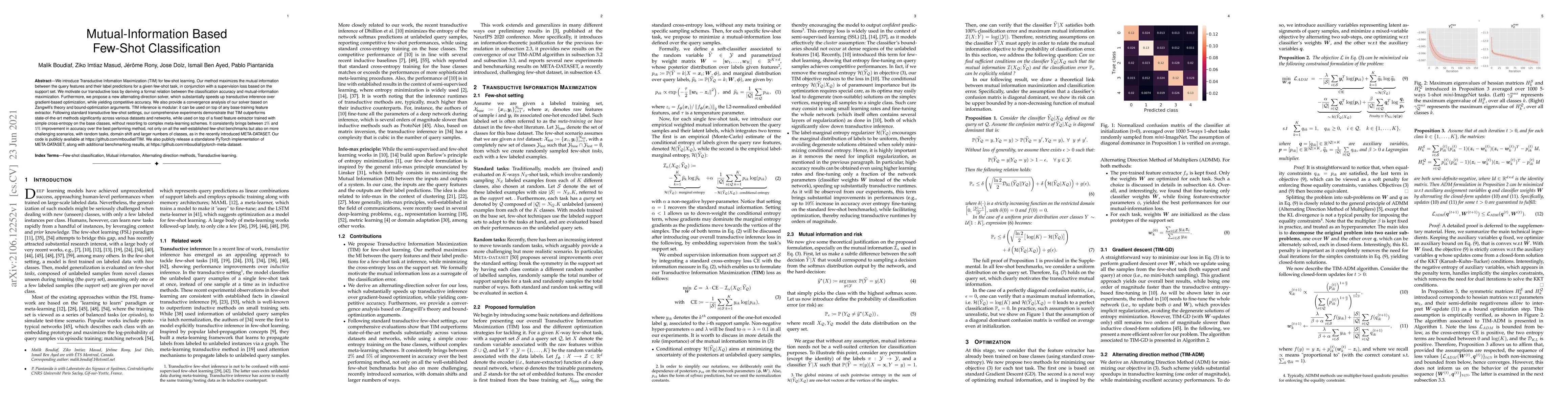 We introduce Transductive Infomation Maximization (TIM) for few-shot learning. Our method maximizes the mutual information between the query features and their label predictions for a given few-shot task, in conjunction with a supervision loss based on the support set. We motivate our transductive loss by deriving a formal relation between the classification accuracy and mutual-information maximization. Furthermore, we propose a new alternating-direction solver, which substantially speeds up transductive inference over gradient-based optimization, while yielding competitive accuracy. We also provide a convergence analysis of our solver based on Zangwill's theory and bound-optimization arguments. TIM inference is modular: it can be used on top of any base-training feature extractor. Following standard transductive few-shot settings, our comprehensive experiments demonstrate that TIM outperforms state-of-the-art methods significantly across various datasets and networks, while used on top of a fixed feature extractor trained with simple cross-entropy on the base classes, without resorting to complex meta-learning schemes. It consistently brings between 2 % and 5 % improvement in accuracy over the best performing method, not only on all the well-established few-shot benchmarks but also on more challenging scenarios, with random tasks, domain shift and larger numbers of classes, as in the recently introduced META-DATASET. Our code is publicly available at https://github.com/mboudiaf/TIM. We also publicly release a standalone PyTorch implementation of META-DATASET, along with additional benchmarking results, at https://github.com/mboudiaf/pytorch-meta-dataset.