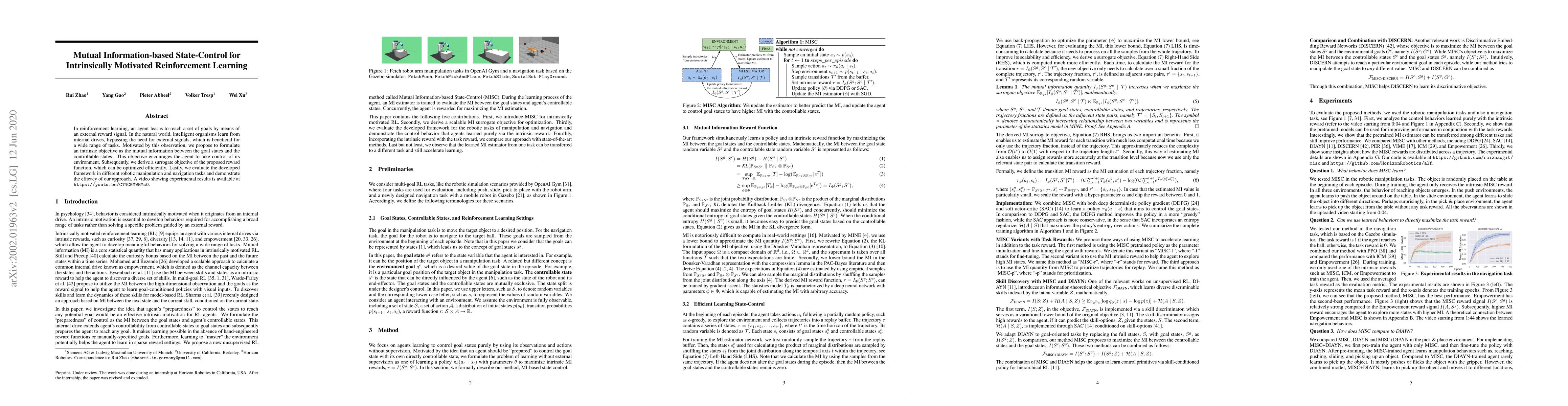 In reinforcement learning, an agent learns to reach a set of goals by means of an external reward signal. In the natural world, intelligent organisms learn from internal drives, bypassing the need for external signals, which is beneficial for a wide range of tasks. Motivated by this observation, we propose to formulate an intrinsic objective as the mutual information between the goal states and the controllable states. This objective encourages the agent to take control of its environment. Subsequently, we derive a surrogate objective of the proposed reward function, which can be optimized efficiently. Lastly, we evaluate the developed framework in different robotic manipulation and navigation tasks and demonstrate the efficacy of our approach. A video showing experimental results is available at https://youtu.be/CT4CKMWBYz0