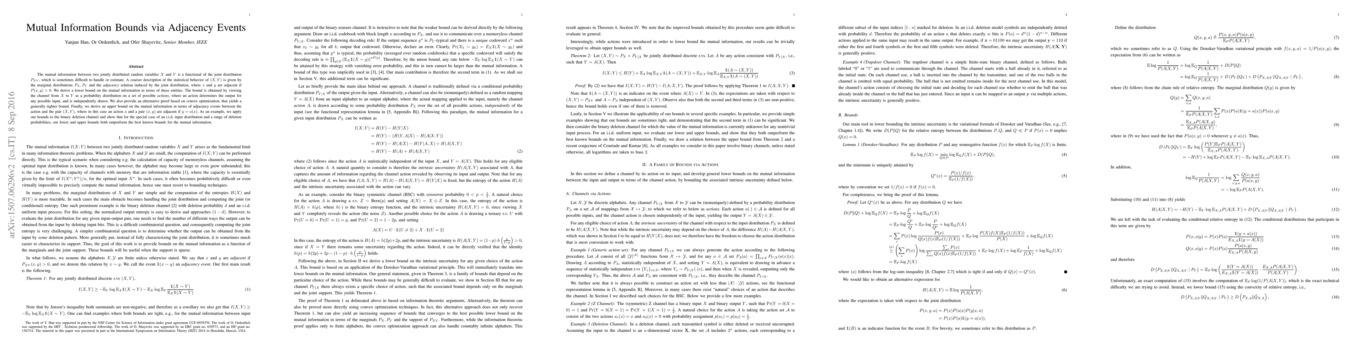 The mutual information between two jointly distributed random variables $X$ and $Y$ is a functional of the joint distribution $P_{XY},$ which is sometimes difficult to handle or estimate. A coarser description of the statistical behavior of $(X,Y)$ is given by the marginal distributions $P_X, P_Y$ and the adjacency relation induced by the joint distribution, where $x$ and $y$ are adjacent if $P(x,y)>0$. We derive a lower bound on the mutual information in terms of these entities. The bound is obtained by viewing the channel from $X$ to $Y$ as a probability distribution on a set of possible actions, where an action determines the output for any possible input, and is independently drawn. We also provide an alternative proof based on convex optimization, that yields a generally tighter bound. Finally, we derive an upper bound on the mutual information in terms of adjacency events between the action and the pair $(X,Y)$, where in this case an action $a$ and a pair $(x,y)$ are adjacent if $y=a(x)$. As an example, we apply our bounds to the binary deletion channel and show that for the special case of an i.i.d. input distribution and a range of deletion probabilities, our lower and upper bounds both outperform the best known bounds for the mutual information.