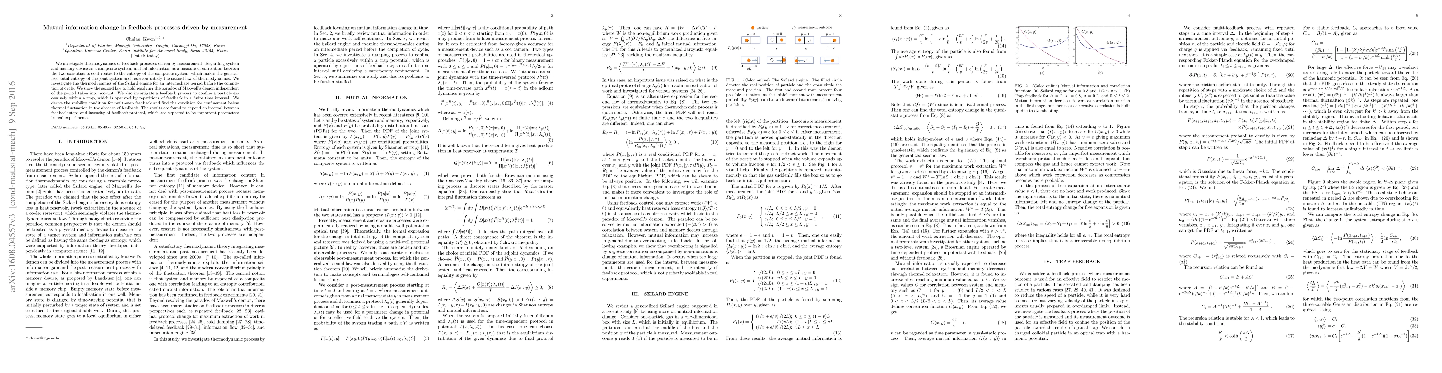 We investigate thermodynamics of feedback processes driven by measurement. Regarding system and memory device as a composite system, mutual information as a measure of correlation between the two constituents contributes to the entropy of the composite system, which makes the generalized total entropy of the joint system and reservoir satisfy the second law of thermodynamics. We investigate the thermodynamics of the Szilard engine for an intermediate period before the completion of cycle. We show the second law to hold resolving the paradox of Maxwell's demon independent of the period taken into account. We also investigate a feedback process to confine a particle excessively within a trap, which is operated by repetitions of feedback in a finite time interval. We derive the stability condition for multi-step feedback and find the condition for confinement below thermal fluctuation in the absence of feedback. The results are found to depend on interval between feedback steps and intensity of feedback protocol, which are expected to be important parameters in real experiments.