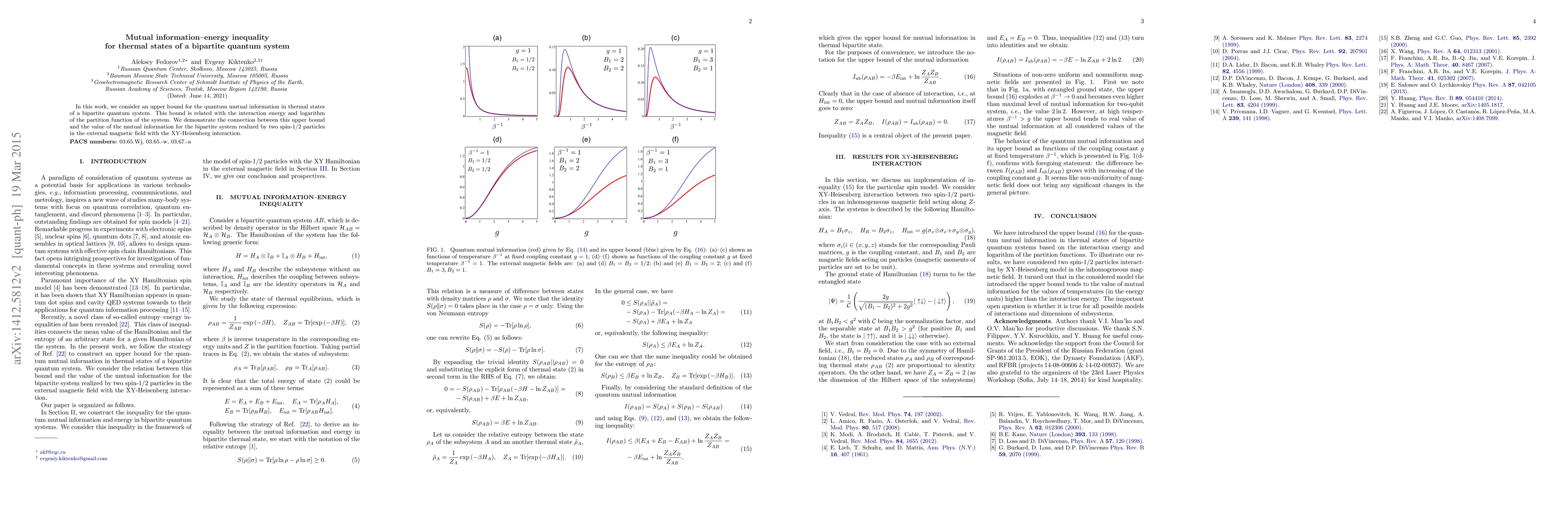 This paper establishes an upper bound for the quantum mutual information in thermal states of a bipartite quantum system, linking it to the interaction energy and the logarithm of the partition function. It specifically applies this bound to a system of two spin-1/2 particles in an external magnetic field with XY-Heisenberg interaction.