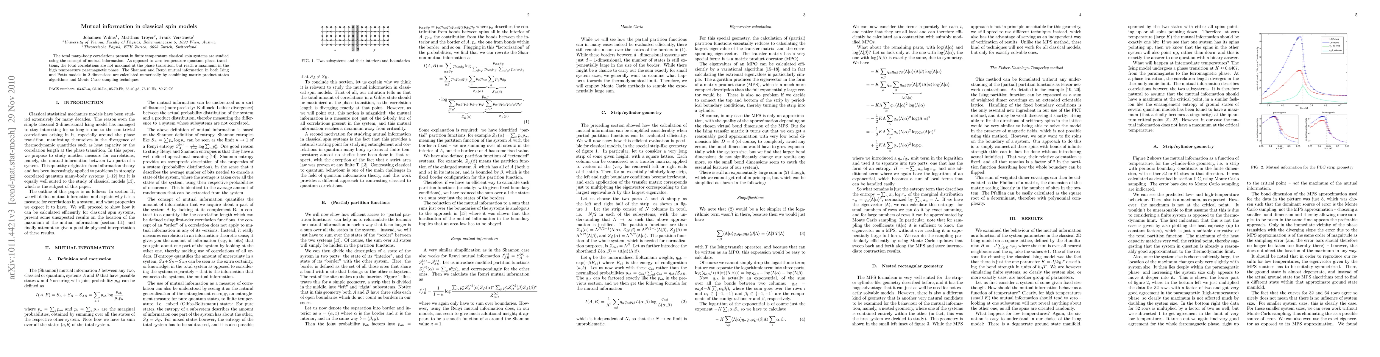 This paper investigates many-body correlations in classical spin systems using mutual information, finding that the highest correlations occur in the high-temperature paramagnetic phase rather than at the phase transition. Numerical calculations for Ising and Potts models utilize matrix product states and Monte Carlo sampling.