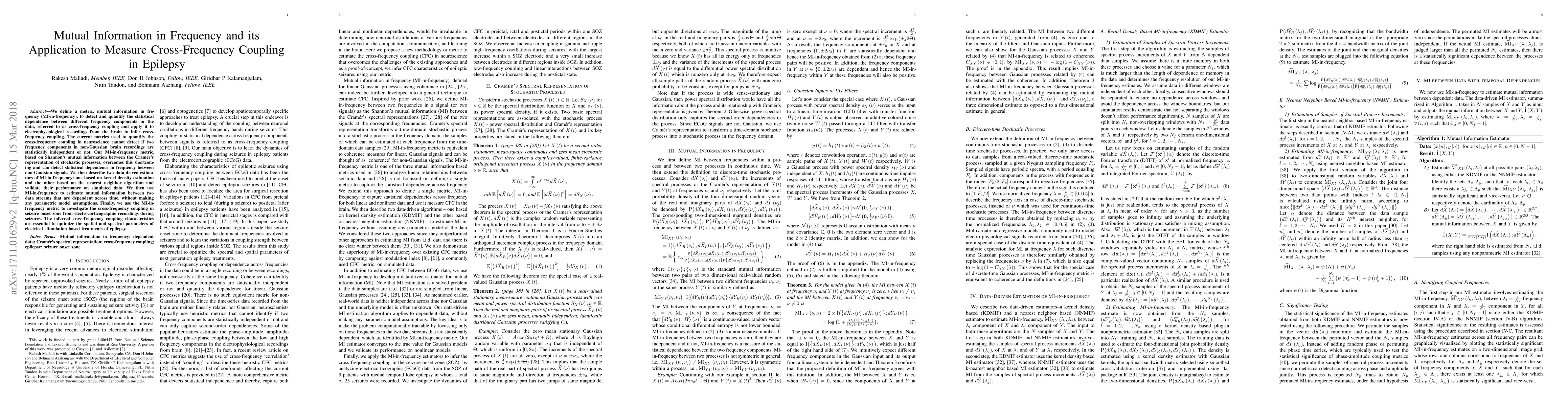 We define a metric, mutual information in frequency (MI-in-frequency), to detect and quantify the statistical dependence between different frequency components in the data, referred to as cross-frequency coupling and apply it to electrophysiological recordings from the brain to infer cross-frequency coupling. The current metrics used to quantify the cross-frequency coupling in neuroscience cannot detect if two frequency components in non-Gaussian brain recordings are statistically independent or not. Our MI-in-frequency metric, based on Shannon's mutual information between the Cramer's representation of stochastic processes, overcomes this shortcoming and can detect statistical dependence in frequency between non-Gaussian signals. We then describe two data-driven estimators of MI-in-frequency: one based on kernel density estimation and the other based on the nearest neighbor algorithm and validate their performance on simulated data. We then use MI-in-frequency to estimate mutual information between two data streams that are dependent across time, without making any parametric model assumptions. Finally, we use the MI-in- frequency metric to investigate the cross-frequency coupling in seizure onset zone from electrocorticographic recordings during seizures. The inferred cross-frequency coupling characteristics are essential to optimize the spatial and spectral parameters of electrical stimulation based treatments of epilepsy.