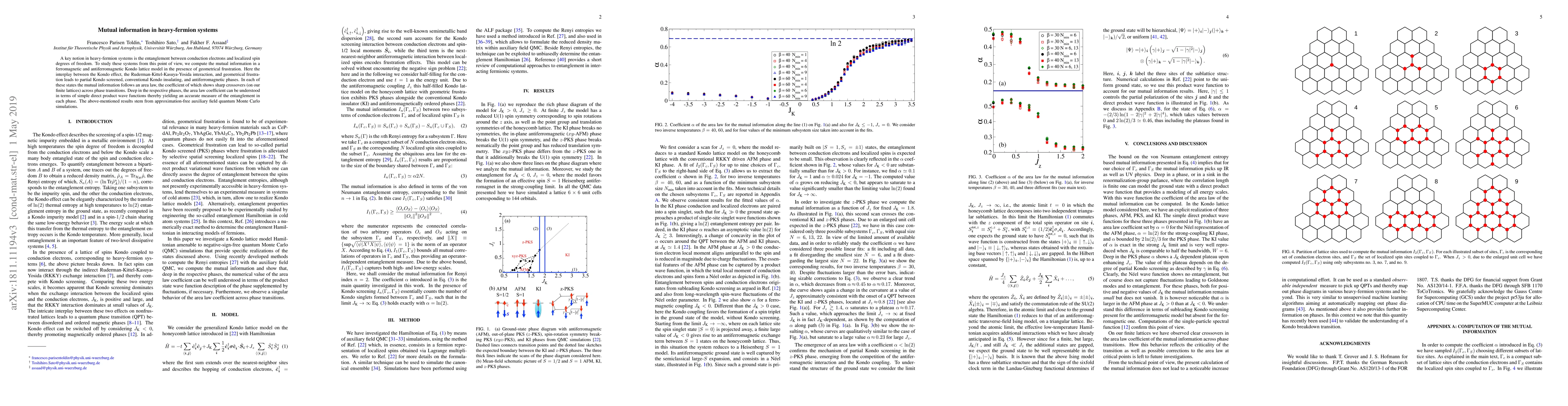 This paper investigates mutual information in heavy-fermion systems, focusing on entanglement between conduction electrons and localized spins in Kondo lattice models under geometrical frustration. The study reveals distinct phase transitions and entanglement measures derived from auxiliary field quantum Monte Carlo simulations.