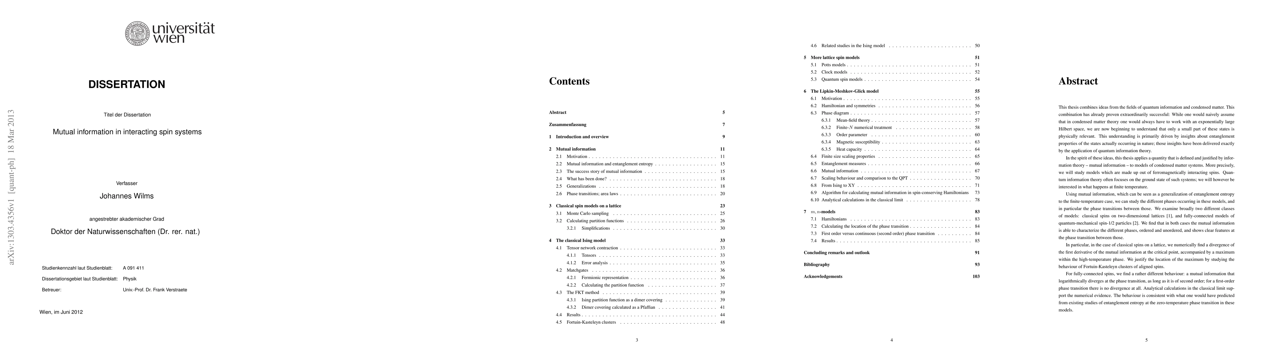 This thesis investigates the mutual information in interacting spin systems, particularly focusing on phase transitions at finite temperatures in both classical and quantum models. It uses mutual information as a tool to explore different phases and transitions in ferromagnetically interacting spin systems.
