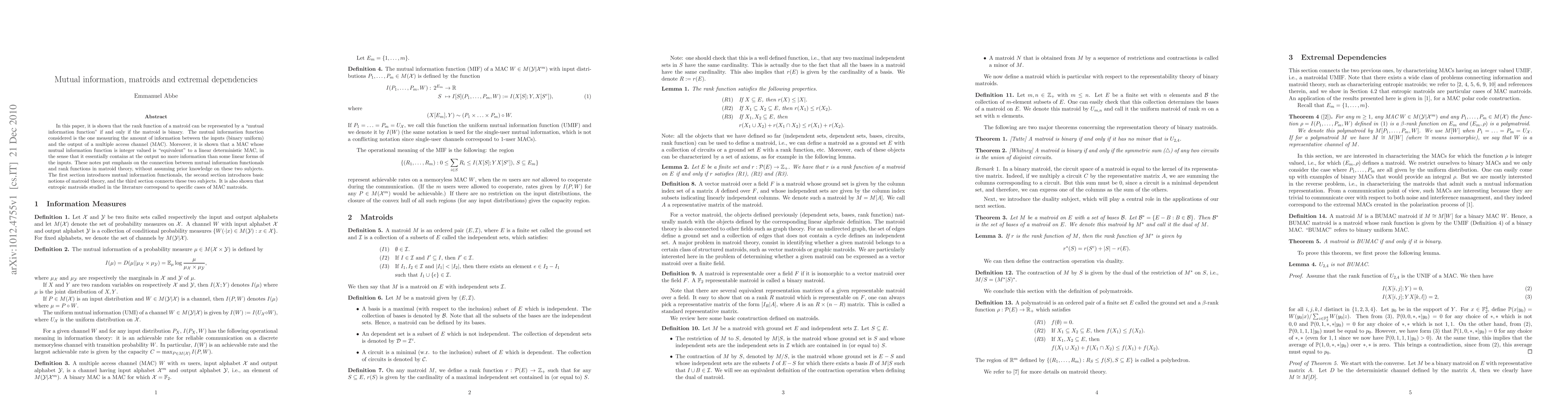 In this paper, it is shown that the rank function of a matroid can be represented by a "mutual information function" if and only if the matroid is binary. The mutual information function considered is the one measuring the amount of information between the inputs (binary uniform) and the output of a multiple access channel (MAC). Moreover, it is shown that a MAC whose mutual information function is integer valued is "equivalent" to a linear deterministic MAC, in the sense that it essentially contains at the output no more information than some linear forms of the inputs. These notes put emphasis on the connection between mutual information functionals and rank functions in matroid theory, without assuming prior knowledge on these two subjects. The first section introduces mutual information functionals, the second section introduces basic notions of matroid theory, and the third section connects these two subjects. It is also shown that entropic matroids studied in the literature correspond to specific cases of MAC matroids.
