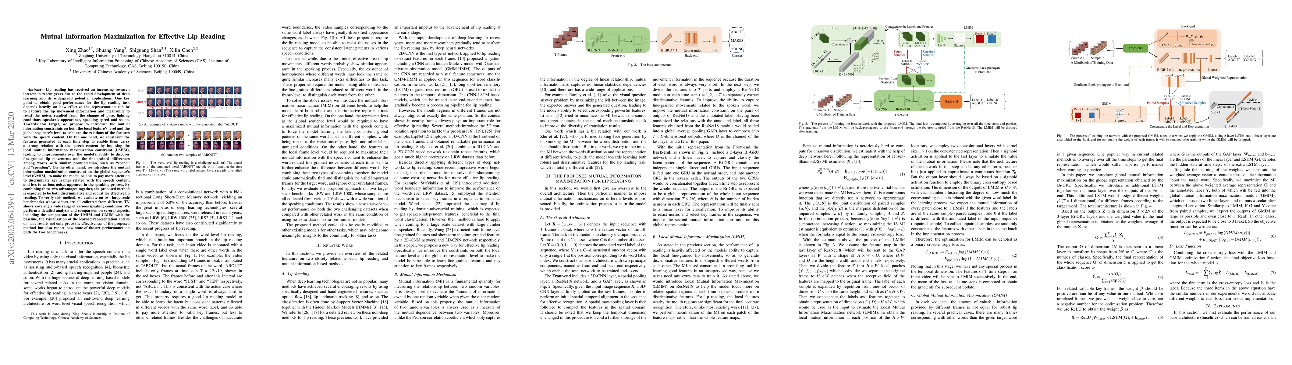 This paper proposes a method for effective lip reading using mutual information constraints to enhance feature representation and improve performance on two large-scale benchmarks.