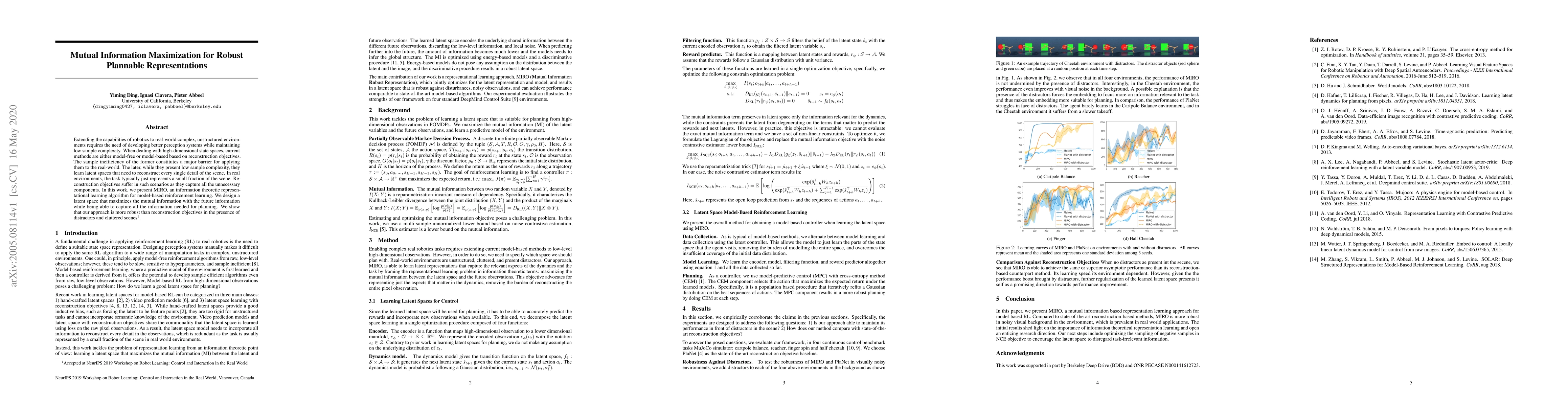 Extending the capabilities of robotics to real-world complex, unstructured environments requires the need of developing better perception systems while maintaining low sample complexity. When dealing with high-dimensional state spaces, current methods are either model-free or model-based based on reconstruction objectives. The sample inefficiency of the former constitutes a major barrier for applying them to the real-world. The later, while they present low sample complexity, they learn latent spaces that need to reconstruct every single detail of the scene. In real environments, the task typically just represents a small fraction of the scene. Reconstruction objectives suffer in such scenarios as they capture all the unnecessary components. In this work, we present MIRO, an information theoretic representational learning algorithm for model-based reinforcement learning. We design a latent space that maximizes the mutual information with the future information while being able to capture all the information needed for planning. We show that our approach is more robust than reconstruction objectives in the presence of distractors and cluttered scenes