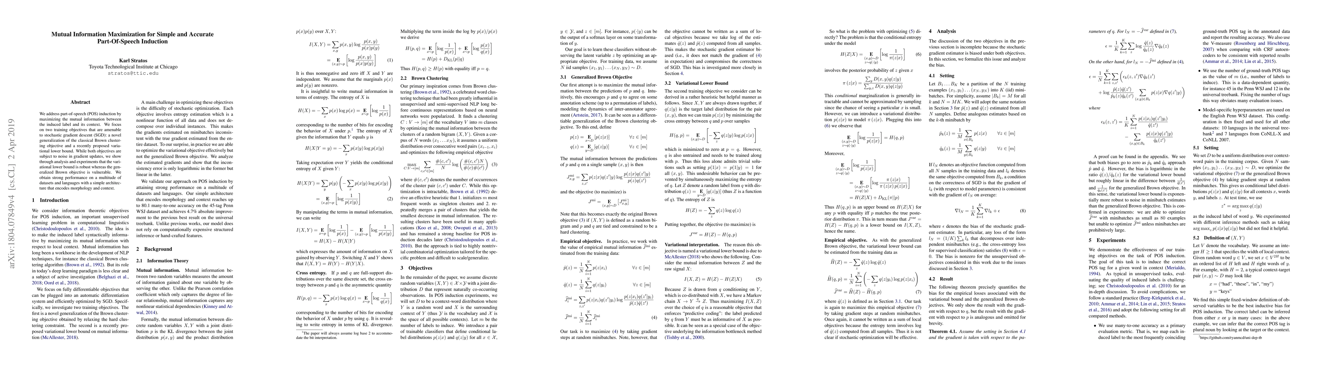 We address part-of-speech (POS) induction by maximizing the mutual information between the induced label and its context. We focus on two training objectives that are amenable to stochastic gradient descent (SGD): a novel generalization of the classical Brown clustering objective and a recently proposed variational lower bound. While both objectives are subject to noise in gradient updates, we show through analysis and experiments that the variational lower bound is robust whereas the generalized Brown objective is vulnerable. We obtain competitive performance on a multitude of datasets and languages with a simple architecture that encodes morphology and context.