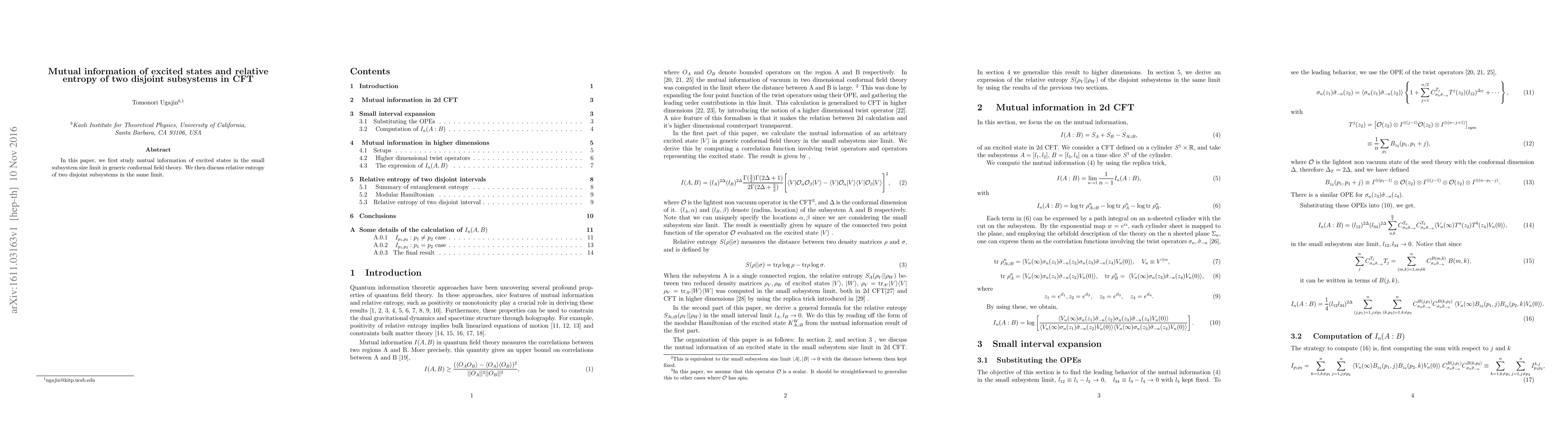This paper explores mutual information in excited states within small subsystem sizes in conformal field theory, followed by an analysis of the relative entropy between two disjoint subsystems under the same conditions.