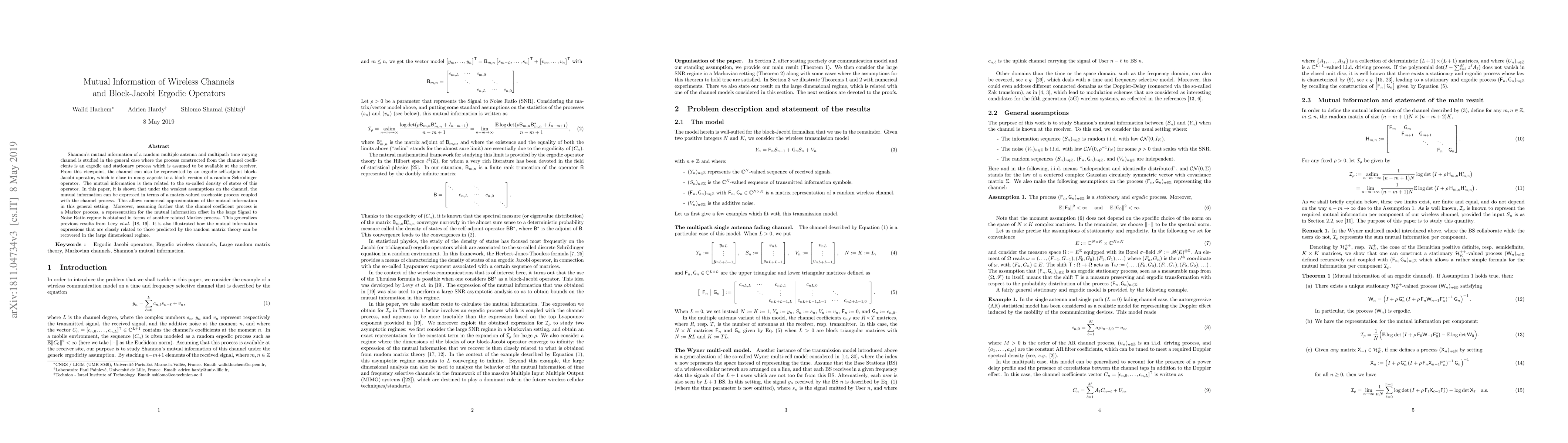 This paper explores Shannon's mutual information in random multiple antenna and multipath channels, representing them via ergodic self-adjoint block-Jacobi operators. It provides a matrix-valued stochastic process expression for mutual information under minimal channel assumptions, and extends results for Markov processes in the large Signal to Noise Ratio regime.