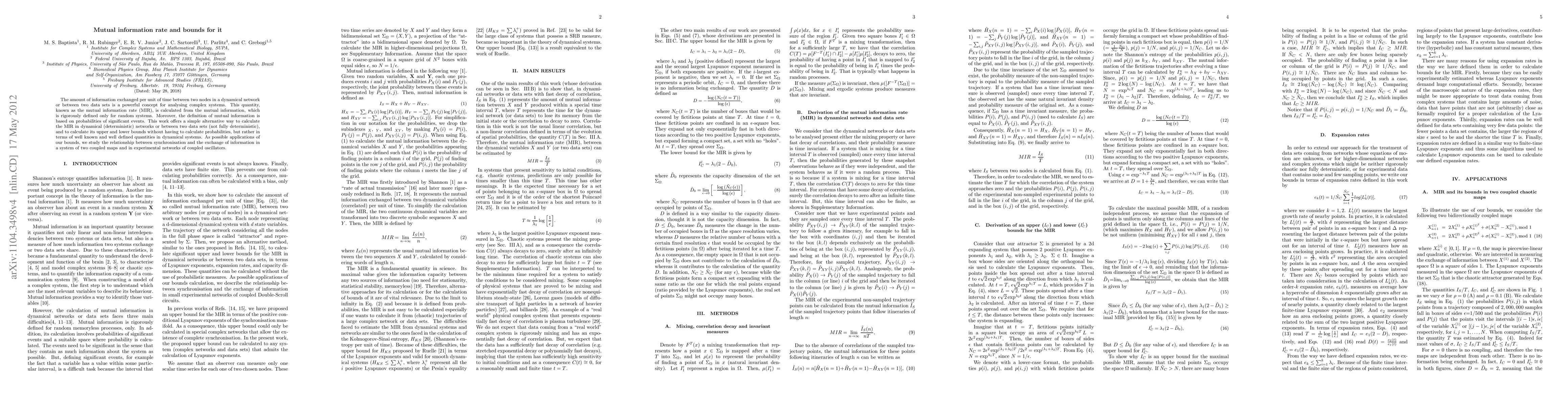 The amount of information exchanged per unit of time between two nodes in a dynamical network or between two data sets is a powerful concept for analysing complex systems. This quantity, known as the mutual information rate (MIR), is calculated from the mutual information, which is rigorously defined only for random systems. Moreover, the definition of mutual information is based on probabilities of significant events. This work offers a simple alternative way to calculate the MIR in dynamical (deterministic) networks or between two data sets (not fully deterministic), and to calculate its upper and lower bounds without having to calculate probabilities, but rather in terms of well known and well defined quantities in dynamical systems. As possible applications of our bounds, we study the relationship between synchronisation and the exchange of information in a system of two coupled maps and in experimental networks of coupled oscillators.