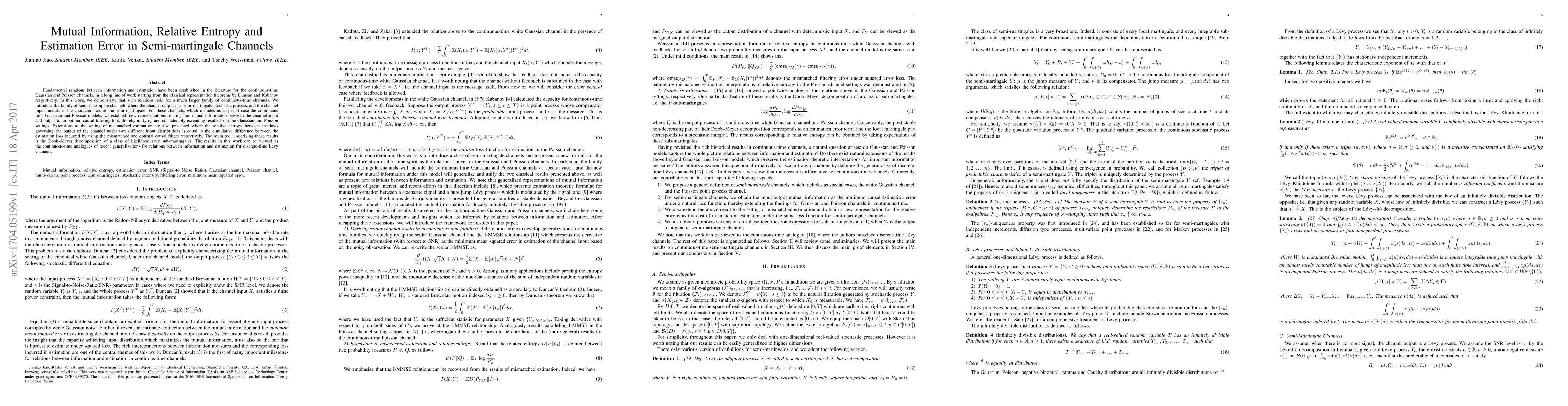 This paper extends fundamental information-estimation relationships to semi-martingale channels, where the output is a semi-martingale stochastic process. It establishes new representations linking mutual information to optimal causal filtering loss, unifying and extending results from Gaussian and Poisson channels.