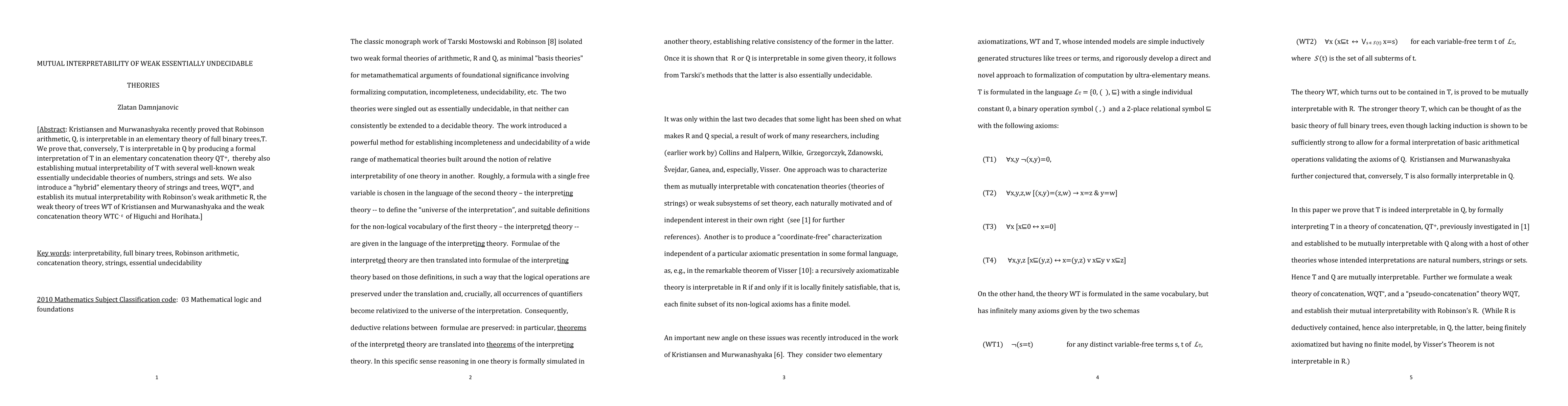 Kristiansen and Murwanashyaka recently proved that Robinson arithmetic Q is interpretable in an elementary theory of full binary trees, T. We prove that, conversely, T is interpretable in Q by producing a formal interpretation of T in an elementary concatenation theory, thereby also establishing mutual interpretability of T with several well-known weak essentially undecidable theories of numbers, strings and sets. We also in introduce a "hybrid" elementary theory of strings and trees and establish its mutual interpretability with Robinson's weak arithmetic R, the weak theory of binary trees WT of Kristiansen and Murwanashyaka and a weak concatenation theory of Higuchi and Hirohata.