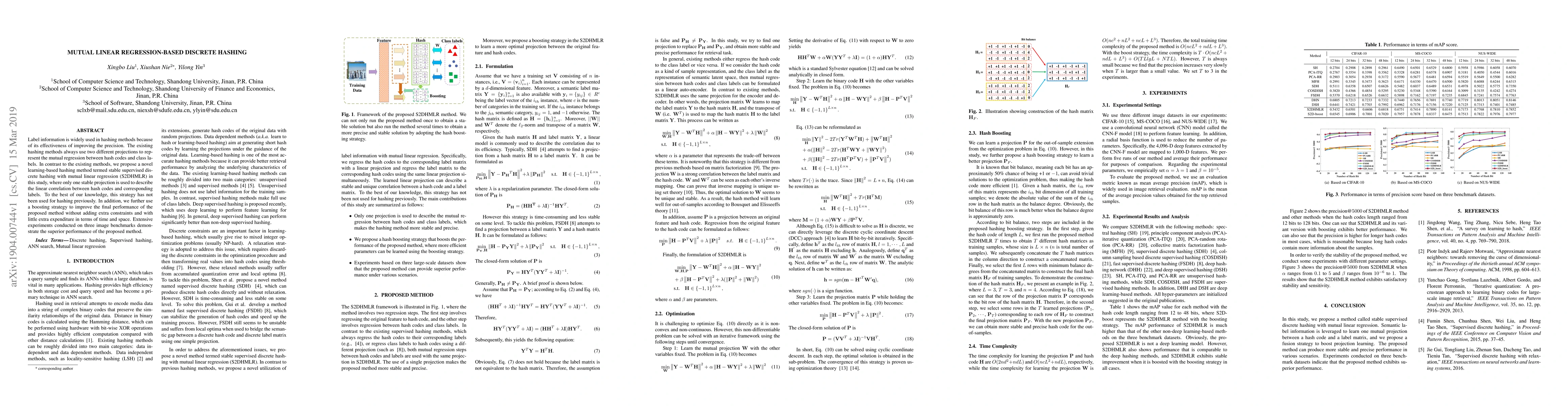 This paper introduces a novel hashing method called stable supervised discrete hashing with mutual linear regression (S2DHMLR), which uses a single stable projection to represent the linear correlation between hash codes and class labels, differing from existing methods that use two projections. The method also employs a boosting strategy to enhance performance with minimal additional cost. Experiments show superior performance on image benchmarks.