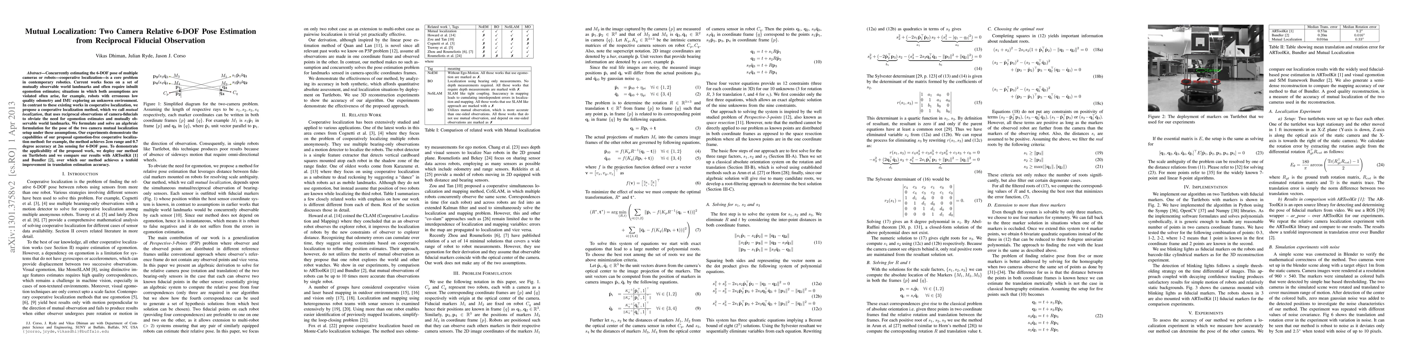 This paper proposes a mutual localization method for estimating the 6-DOF pose of two cameras using reciprocal fiducial observations, eliminating the need for egomotion estimates and mutually observable world landmarks. The method achieves 2cm range and 0.7 degree accuracy for 6-DOF pose estimation and shows a 10-fold improvement in translation accuracy compared to ARToolKit and Bundler.