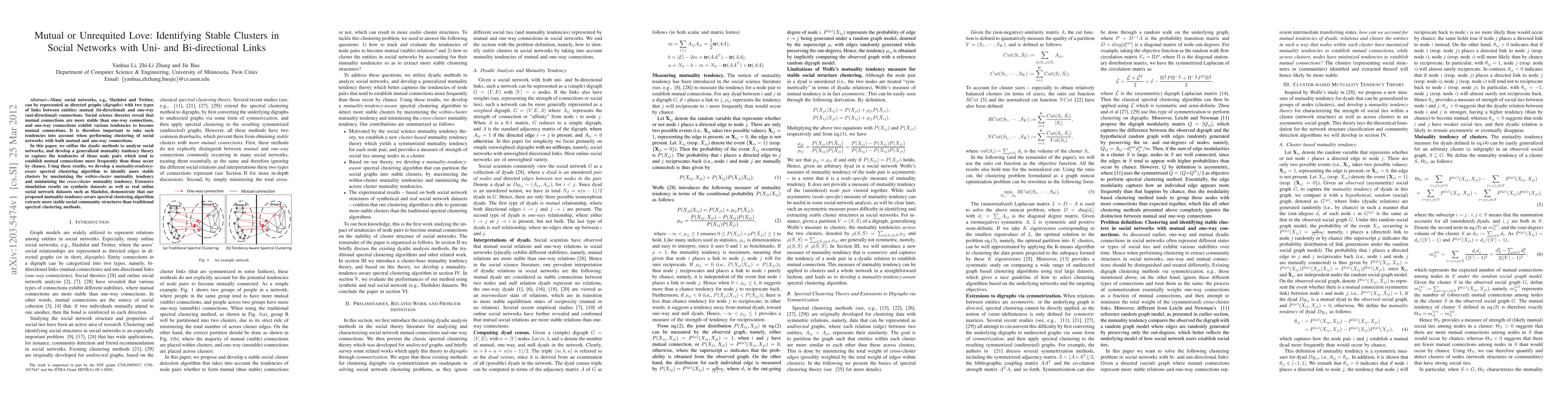 Many social networks, e.g., Slashdot and Twitter, can be represented as directed graphs (digraphs) with two types of links between entities: mutual (bi-directional) and one-way (uni-directional) connections. Social science theories reveal that mutual connections are more stable than one-way connections, and one-way connections exhibit various tendencies to become mutual connections. It is therefore important to take such tendencies into account when performing clustering of social networks with both mutual and one-way connections. In this paper, we utilize the dyadic methods to analyze social networks, and develop a generalized mutuality tendency theory to capture the tendencies of those node pairs which tend to establish mutual connections more frequently than those occur by chance. Using these results, we develop a mutuality-tendency-aware spectral clustering algorithm to identify more stable clusters by maximizing the within-cluster mutuality tendency and minimizing the cross-cluster mutuality tendency. Extensive simulation results on synthetic datasets as well as real online social network datasets such as Slashdot, demonstrate that our proposed mutuality-tendency-aware spectral clustering algorithm extracts more stable social community structures than traditional spectral clustering methods.