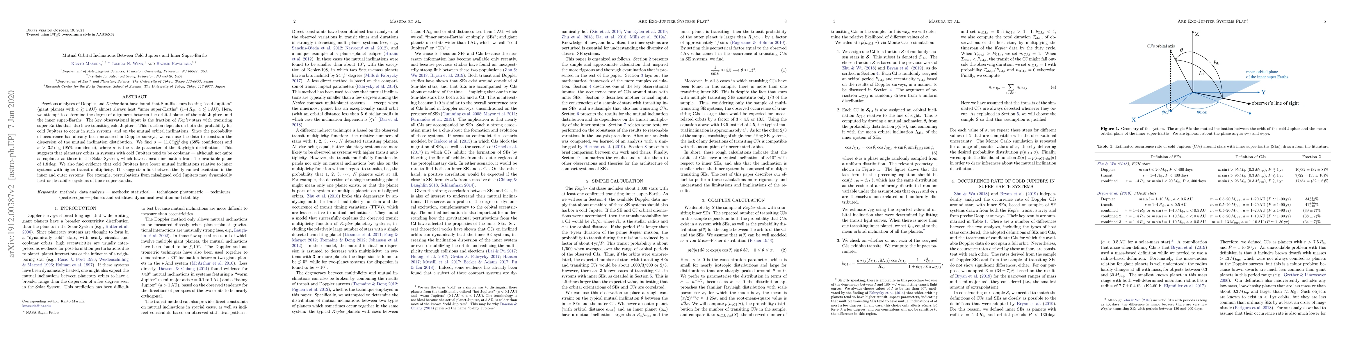 Previous analyses of Doppler and Kepler data have found that Sun-like stars hosting "cold Jupiters" (giant planets with $a\gtrsim 1\,\mathrm{AU}$) almost always host "inner super-Earths" (1-$4\,R_\oplus$, $a\lesssim1\,\mathrm{AU}$). Here, we attempt to determine the degree of alignment between the orbital planes of the cold Jupiters and the inner super-Earths. The key observational input is the fraction of Kepler stars with transiting super-Earths that also have transiting cold Jupiters. This fraction depends on both the probability for cold Jupiters to occur in such systems, and on the mutual orbital inclinations. Since the probability of occurrence has already been measured in Doppler surveys, we can use the data to constrain the dispersion of the mutual inclination distribution. We find $\sigma=11.8^{+12.7}_{-5.5}\,\mathrm{deg}$ (68% confidence) and $\sigma>3.5\,\mathrm{deg}$ (95% confidence), where $\sigma$ is the scale parameter of the Rayleigh distribution. This suggests that planetary orbits in systems with cold Jupiters tend to be coplanar - although not quite as coplanar as those in the Solar System, which have a mean inclination from the invariable plane of $1.8\,\mathrm{deg}$. We also find evidence that cold Jupiters have lower mutual inclinations relative to inner systems with higher transit multiplicity. This suggests a link between the dynamical excitation in the inner and outer systems. For example, perturbations from misaligned cold Jupiters may dynamically heat or destabilize systems of inner super-Earths.
