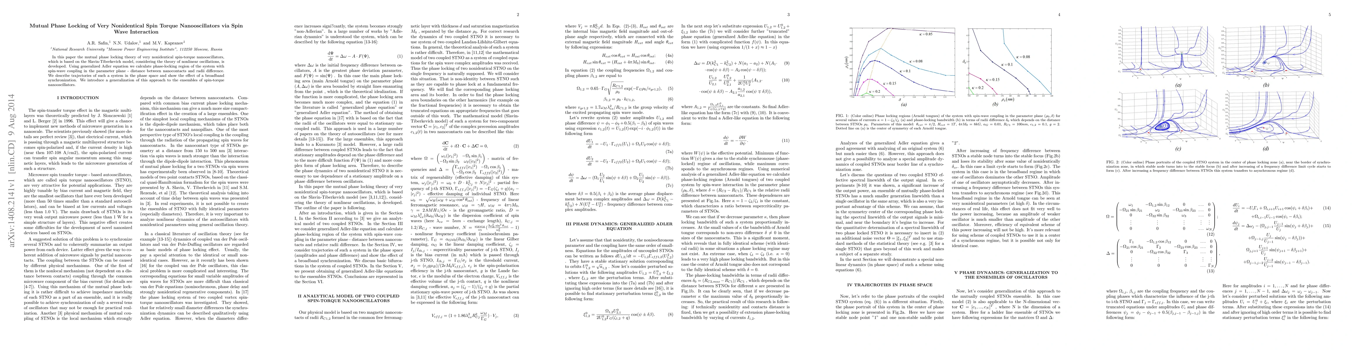 In this paper the mutual phase locking theory of very nonidentical spin-torque nanooscillators, which is based on the Slavin-Tiberkevich model, considering the theory of nonlinear oscillations, is developed. Using generalized Adler equation we calculate phase-locking region of the system with spinwave coupling in the parameter plane - distance between nanocontacts and radii difference. We describe trajectories of such a system in the phase space and show the effect of a broadband synchronization. We introduce a generalization of this approach to the ensembles of spin-torque nanooscillators