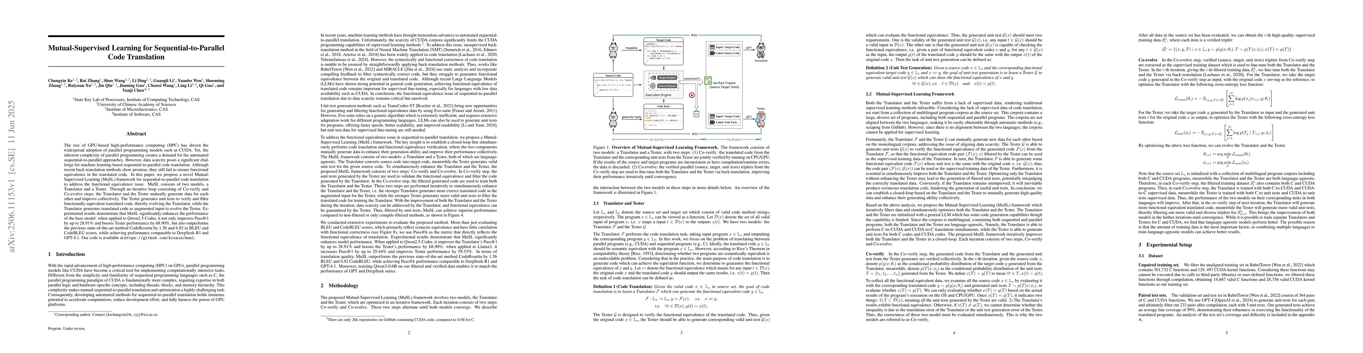 The rise of GPU-based high-performance computing (HPC) has driven the widespread adoption of parallel programming models such as CUDA. Yet, the inherent complexity of parallel programming creates a demand for the automated sequential-to-parallel approaches. However, data scarcity poses a significant challenge for machine learning-based sequential-to-parallel code translation. Although recent back-translation methods show promise, they still fail to ensure functional equivalence in the translated code. In this paper, we propose a novel Mutual-Supervised Learning (MSL) framework for sequential-to-parallel code translation to address the functional equivalence issue. MSL consists of two models, a Translator and a Tester. Through an iterative loop consisting of Co-verify and Co-evolve steps, the Translator and the Tester mutually generate data for each other and improve collectively. The Tester generates unit tests to verify and filter functionally equivalent translated code, thereby evolving the Translator, while the Translator generates translated code as augmented input to evolve the Tester. Experimental results demonstrate that MuSL significantly enhances the performance of the base model: when applied to Qwen2.5-Coder, it not only improves Pass@1 by up to 28.91% and boosts Tester performance by 68.90%, but also outperforms the previous state-of-the-art method CodeRosetta by 1.56 and 6.92 in BLEU and CodeBLEU scores, while achieving performance comparable to DeepSeek-R1 and GPT-4.1. Our code is available at https://github.com/kcxain/musl.