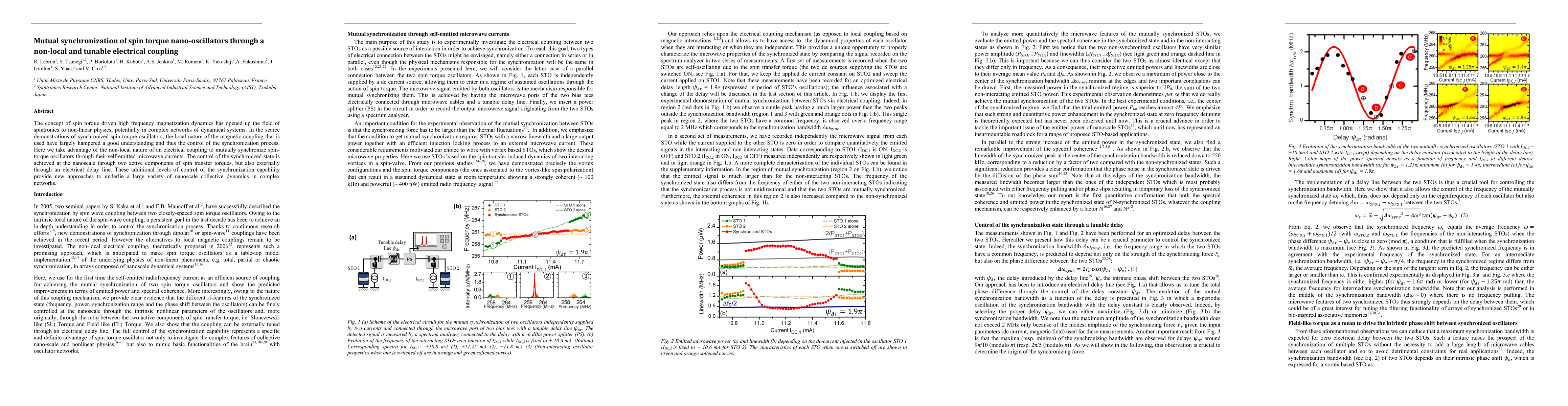 This paper explores mutual synchronization of spin torque nano-oscillators using non-local electrical coupling, overcoming the limitations of local magnetic coupling. The synchronization is controlled via spin transfer torques and an external electrical delay line, offering new methods for managing collective dynamics in nanoscale networks.