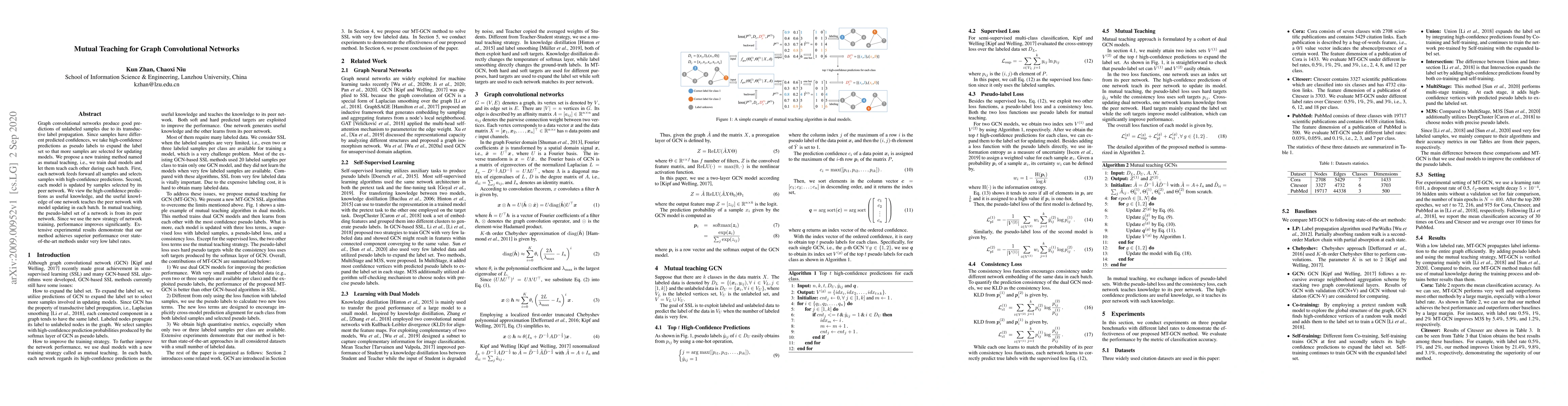 Graph convolutional networks produce good predictions of unlabeled samples due to its transductive label propagation. Since samples have different predicted confidences, we take high-confidence predictions as pseudo labels to expand the label set so that more samples are selected for updating models. We propose a new training method named as mutual teaching, i.e., we train dual models and let them teach each other during each batch. First, each network feeds forward all samples and selects samples with high-confidence predictions. Second, each model is updated by samples selected by its peer network. We view the high-confidence predictions as useful knowledge, and the useful knowledge of one network teaches the peer network with model updating in each batch. In mutual teaching, the pseudo-label set of a network is from its peer network. Since we use the new strategy of network training, performance improves significantly. Extensive experimental results demonstrate that our method achieves superior performance over state-of-the-art methods under very low label rates.