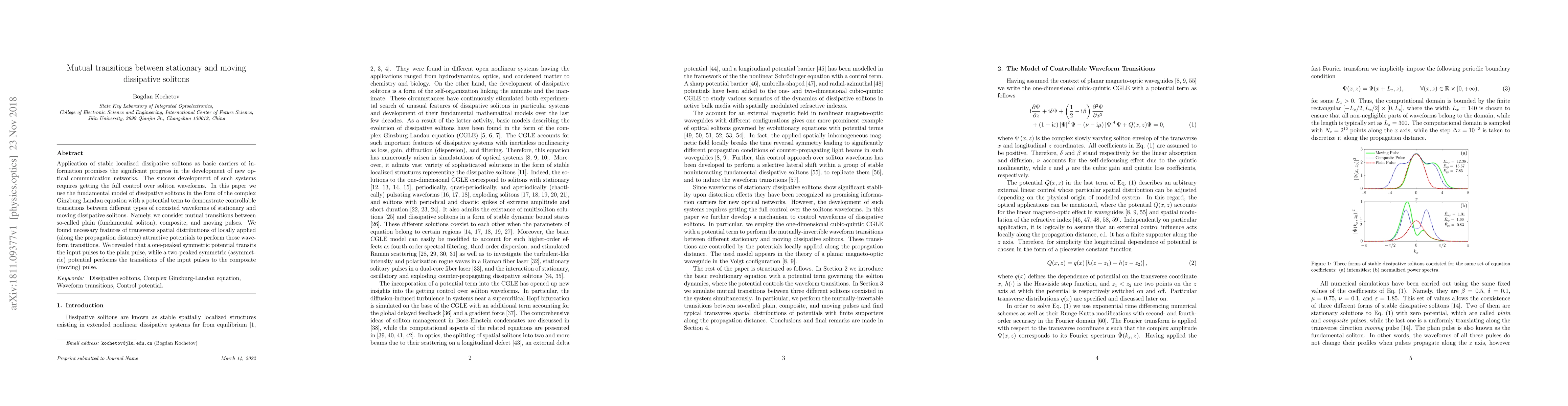 This paper explores controllable transitions between stationary and moving dissipative solitons using the complex Ginzburg-Landau equation. It identifies specific potentials that facilitate transitions between plain, composite, and moving pulses, highlighting the potential for advanced optical communication networks.