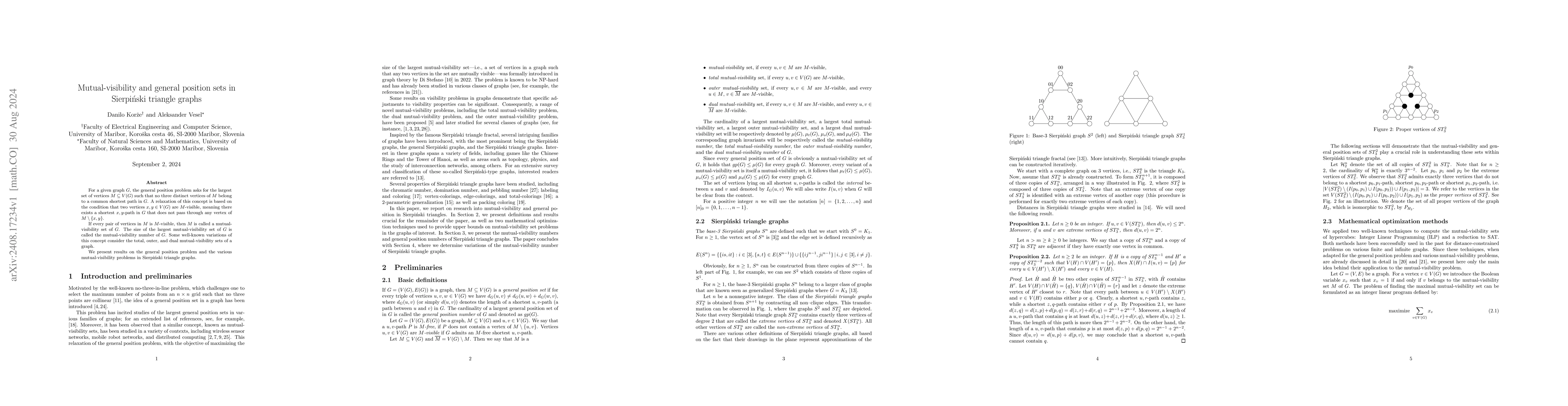 The paper investigates the general position problem and mutual-visibility sets within Sierpiński triangle graphs, focusing on the largest set of vertices where no three form a common shortest path and where every pair of vertices in this set is mutually visible. Results on these concepts are presented.