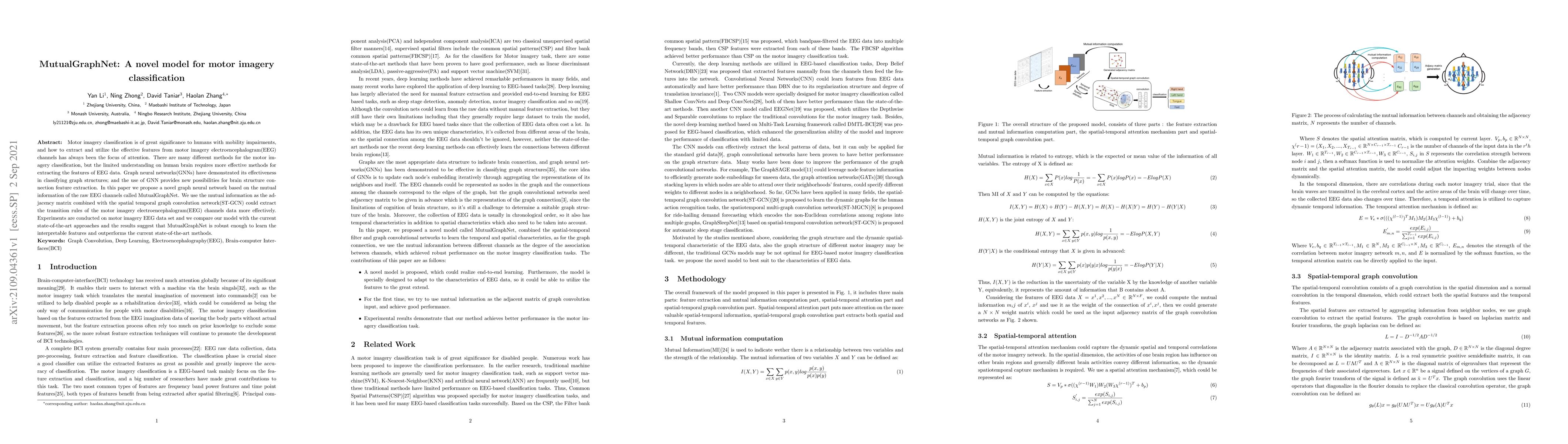 MutualGraphNet is a novel graph neural network model that leverages mutual information to construct an adjacency matrix for spatial-temporal graph convolution, enhancing the classification of motor imagery from EEG data. The proposed method outperforms existing state-of-the-art techniques, demonstrating its robustness and effectiveness in extracting interpretable features.