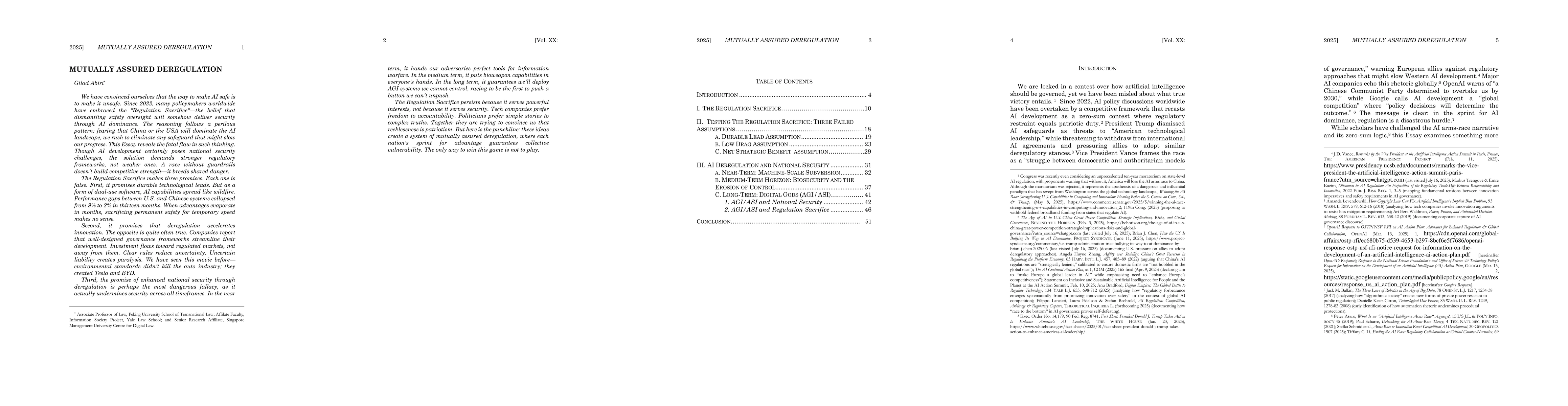 We have convinced ourselves that the way to make AI safe is to make it unsafe. Since 2022, policymakers worldwide have embraced the Regulation Sacrifice - the belief that dismantling safety oversight will deliver security through AI dominance. Fearing China or USA will gain advantage, nations rush to eliminate safeguards that might slow progress. This Essay reveals the fatal flaw: though AI poses national security challenges, the solution demands stronger regulatory frameworks, not weaker ones. A race without guardrails breeds shared danger, not competitive strength. The Regulation Sacrifice makes three false promises. First, it promises durable technological leads. But AI capabilities spread rapidly - performance gaps between U.S. and Chinese systems collapsed from 9 percent to 2 percent in thirteen months. When advantages evaporate in months, sacrificing permanent safety for temporary speed makes no sense. Second, it promises deregulation accelerates innovation. The opposite often proves true. Companies report well-designed governance streamlines development. Investment flows toward regulated markets. Clear rules reduce uncertainty; uncertain liability creates paralysis. Environmental standards did not kill the auto industry; they created Tesla and BYD. Third, enhanced national security through deregulation actually undermines security across all timeframes. Near term: it hands adversaries information warfare tools. Medium term: it democratizes bioweapon capabilities. Long term: it guarantees deployment of uncontrollable AGI systems. The Regulation Sacrifice persists because it serves powerful interests, not security. Tech companies prefer freedom to accountability. Politicians prefer simple stories to complex truths. This creates mutually assured deregulation, where each nation's sprint for advantage guarantees collective vulnerability. The only way to win is not to play.
