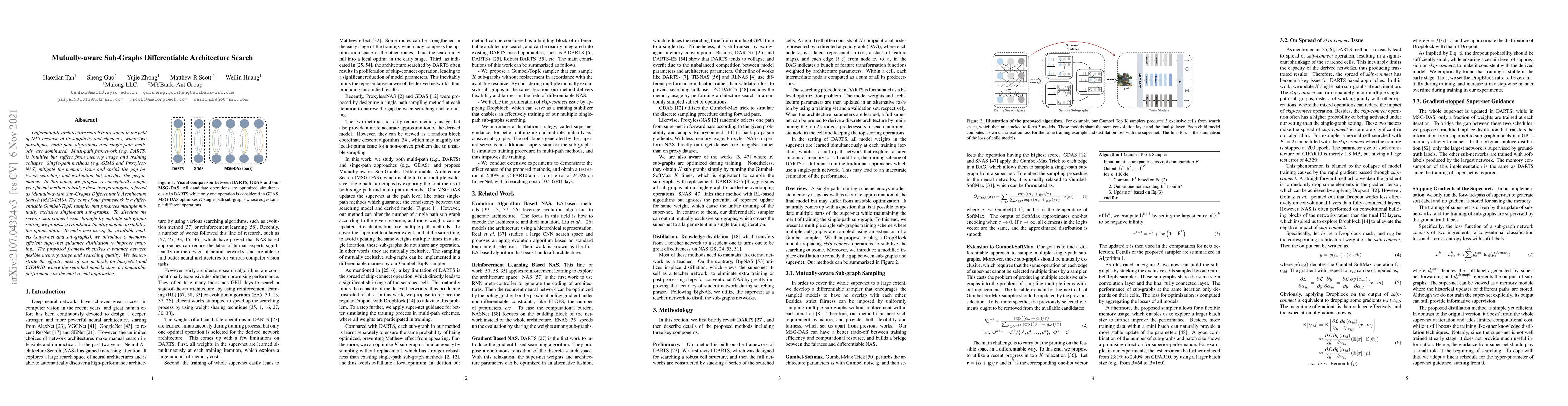 Differentiable architecture search is prevalent in the field of NAS because of its simplicity and efficiency, where two paradigms, multi-path algorithms and single-path methods, are dominated. Multi-path framework (e.g. DARTS) is intuitive but suffers from memory usage and training collapse. Single-path methods (e.g.GDAS and ProxylessNAS) mitigate the memory issue and shrink the gap between searching and evaluation but sacrifice the performance. In this paper, we propose a conceptually simple yet efficient method to bridge these two paradigms, referred as Mutually-aware Sub-Graphs Differentiable Architecture Search (MSG-DAS). The core of our framework is a differentiable Gumbel-TopK sampler that produces multiple mutually exclusive single-path sub-graphs. To alleviate the severer skip-connect issue brought by multiple sub-graphs setting, we propose a Dropblock-Identity module to stabilize the optimization. To make best use of the available models (super-net and sub-graphs), we introduce a memory-efficient super-net guidance distillation to improve training. The proposed framework strikes a balance between flexible memory usage and searching quality. We demonstrate the effectiveness of our methods on ImageNet and CIFAR10, where the searched models show a comparable performance as the most recent approaches.