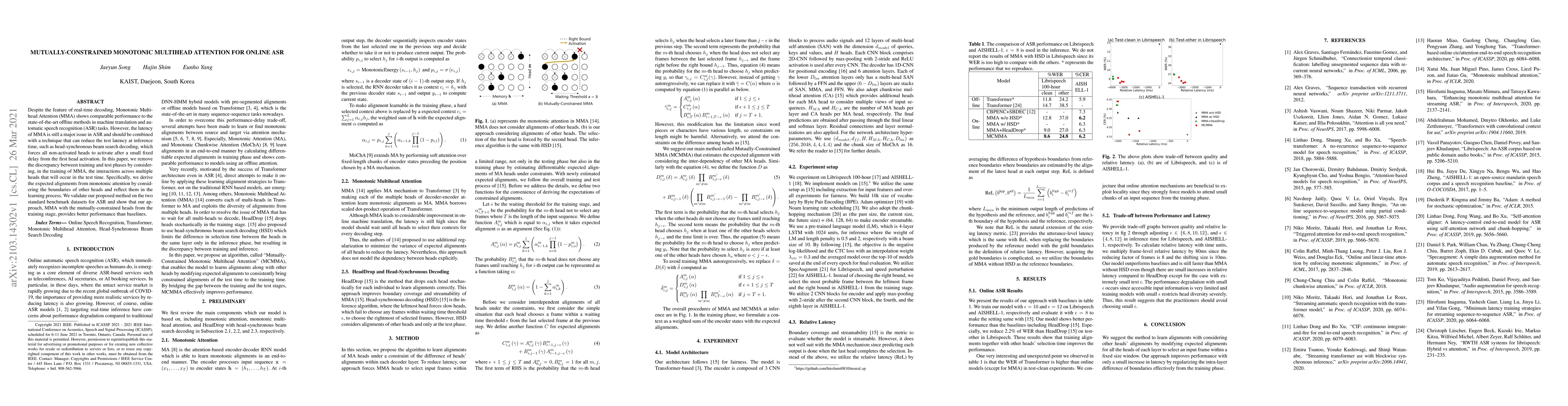 This paper proposes a mutually-constrained monotonic multihead attention (MMA) method to reduce latency in online automatic speech recognition (ASR). By incorporating head-synchronous beam search and training MMA with expected alignments from interactions across heads, the approach achieves better performance than baselines while maintaining real-time decoding capability.