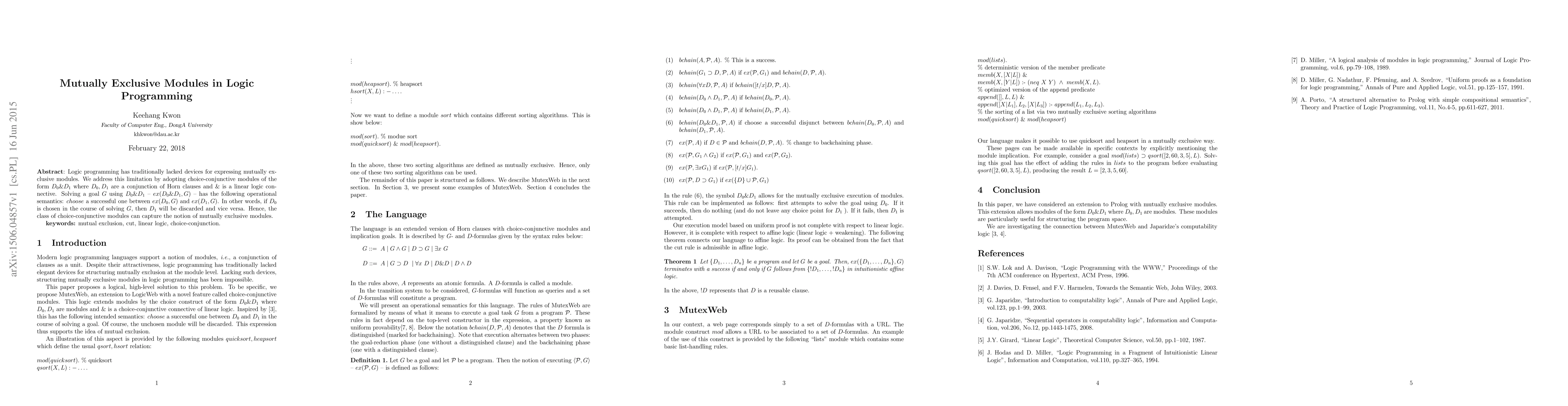 Logic programming has traditionally lacked devices for expressing mutually exclusive modules. We address this limitation by adopting choice-conjunctive modules of the form $D_0 \& D_1$ where $D_0, D_1$ are a conjunction of Horn clauses and $\&$ is a linear logic connective. Solving a goal $G$ using $D_0 \& D_1$ -- $exec(D_0 \& D_1,G)$ -- has the following operational semantics: $choose$ a successful one between $exec(D_0,G)$ and $exec(D_1,G)$. In other words, if $D_0$ is chosen in the course of solving $G$, then $D_1$ will be discarded and vice versa. Hence, the class of choice-conjunctive modules can capture the notion of mutually exclusive modules.