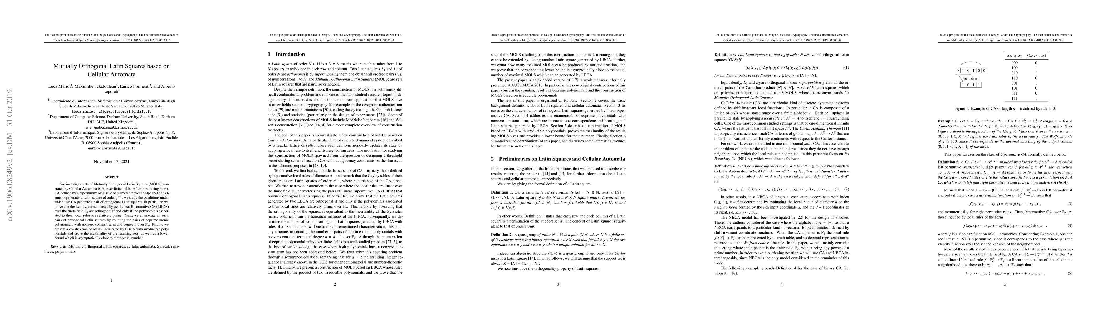This paper explores the generation of Mutually Orthogonal Latin Squares (MOLS) via Cellular Automata (CA) over finite fields, proving that Linear Bipermutive CA (LBCA) generate orthogonal Latin squares if their associated polynomials are relatively prime. The study concludes with the enumeration of such pairs and the construction of maximal MOLS sets using irreducible polynomials.