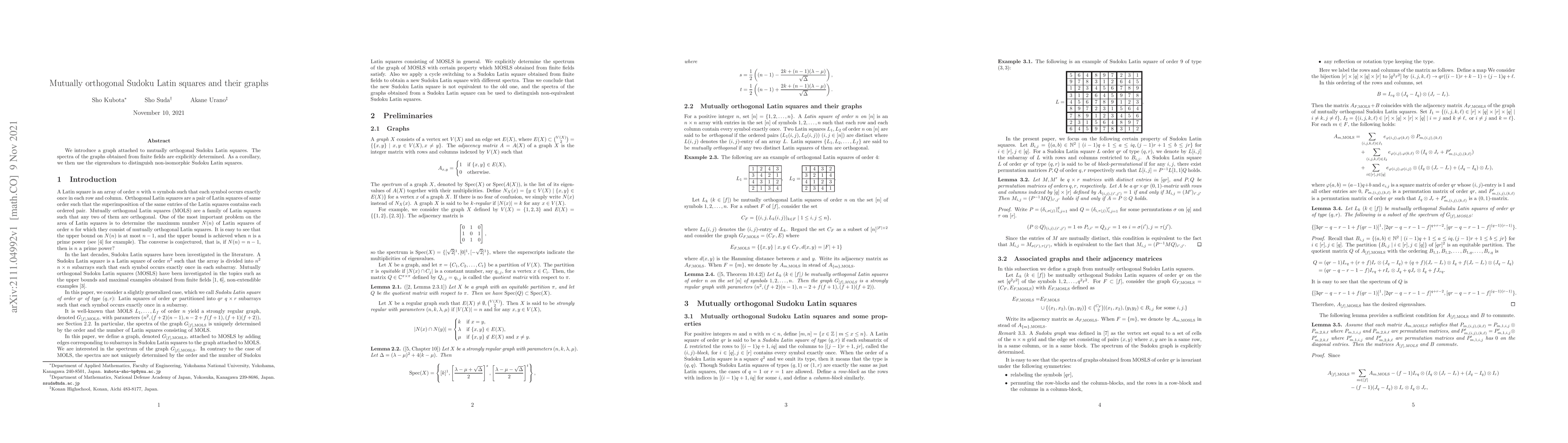Summary: This paper explores graphs derived from mutually orthogonal Sudoku Latin squares, determining their spectra for finite fields and using the eigenvalues to differentiate non-isomorphic Sudoku Latin squares.