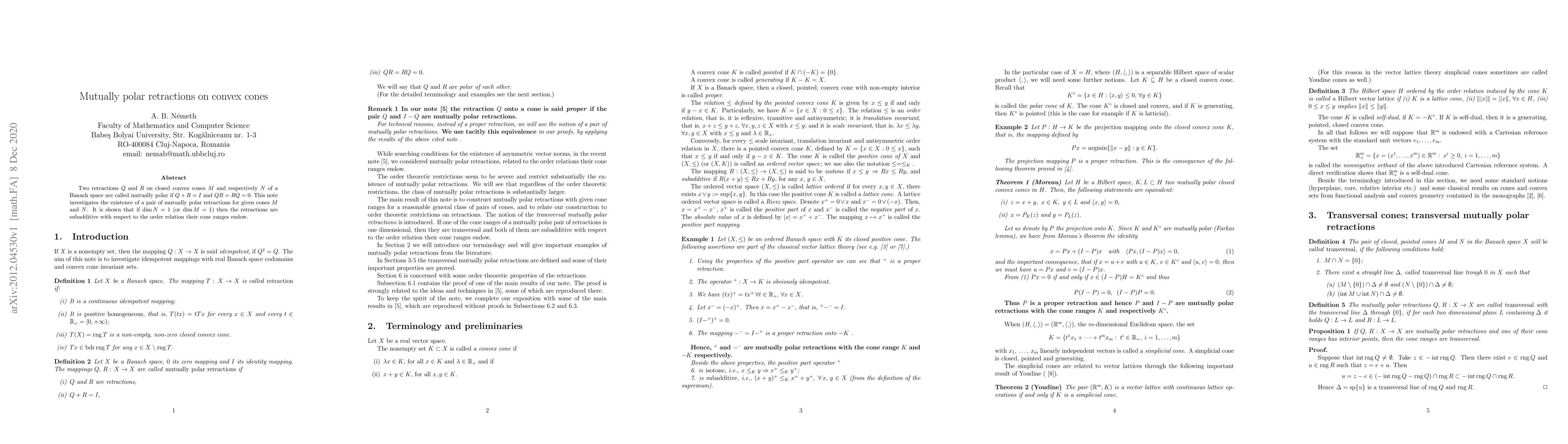 Summary: This paper explores the existence of mutually polar retractions on closed convex cones in a Banach space, where such retractions satisfy Q+R=I and QR=RQ=0. It demonstrates that when one of the cones has dimension one, the retractions exhibit subadditivity concerning the order relation defined by their cone ranges.